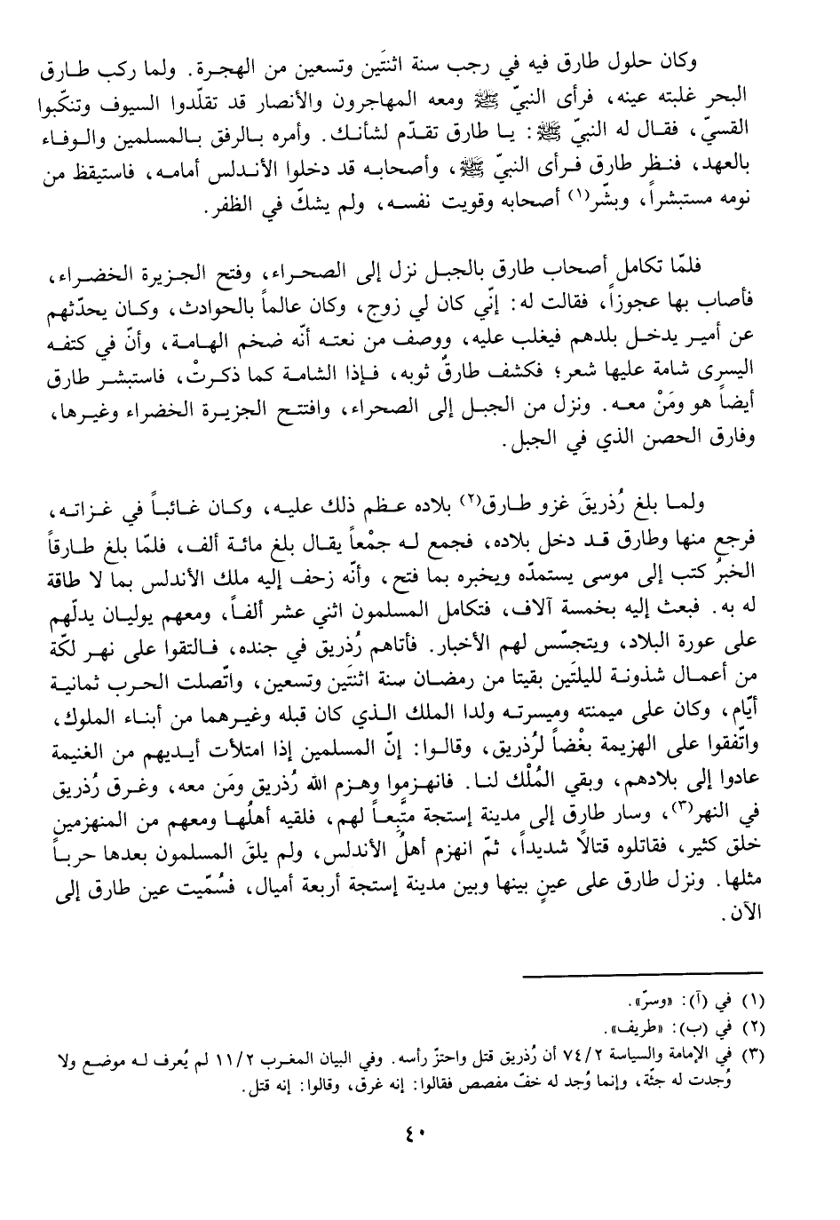 وَلَمَّا بَلَغَ رُذَرِيقُ غَزْوَ طَارِقٍ بِلَادَهُ عَظُمَ ذَلِكَ عَلَيْهِ، وَكَانَ غَائِبًا فِي غَزَاتِهِ، فَرَجَعَ مِنْهَا وَطَارِقٌ قَدْ دَخَلَ بِلَادَهُ، فَجَمَعَ لَهُ جَمْعًا يُقَالُ بَلَغَ مِائَةَ أَلْفٍ، فَلَمَّا بَلَغَ طَارِقًا الْخَبَرُ كَتَبَ إِلَى مُوسَى يَسْتَمِدُّهُ وَيُخْبِرُهُ بِمَا فَتَحَ، وَأَنَّهُ زَحَفَ إِلَيْهِ مَلِكُ الْأَنْدَلُسِ بِمَا لَا طَاقَةَ لَهُ بِهِ. فَبَعَثَ إِلَيْهِ بِخَمْسَةِ آلَافٍ، فَتَكَامَلَ الْمُسْلِمُونَ اثْنَيْ عَشَرَ أَلْفًا، وَمَعَهُمْ يُولْيَانُ يَدُلُّهُمْ عَلَى عَوْرَةِ الْبِلَادِ، وَيَتَجَسَّسُ لَهُمُ الْأَخْبَارَ. فَأَتَاهُمْ رُذَرِيقُ فِي جُنْدِهِ، فَالْتَقَوْا عَلَى نَهْرِ لَكَّةَ مِنْ أَعْمَالِ شَذُونَةَ لِلَيْلَتَيْنِ بَقِيَتَا مِنْ رَمَضَانَ سَنَةَ اثْنَتَيْنِ وَتِسْعِينَ، وَاتَّصَلَتِ الْحَرْبُ ثَمَانِيَةَ أَيَّامٍ، وَكَانَ عَلَى مَيْمَنَتِهِ وَمَيْسَرَتِهِ وَلَدَا الْمَلِكِ الَّذِي كَانَ قَبْلَهُ وَغَيْرُهُمَا مِنْ أَبْنَاءِ الْمُلُوكِ، وَاتَّفَقُوا عَلَى الْهَزِيمَةِ بُغْضًا لِرُذَرِيقَ، وَقَالُوا: إِنَّ الْمُسْلِمِينَ إِذَا امْتَلَأَتْ أَيْدِيهِمْ مِنَ الْغَنِيمَةِ عَادُوا إِلَى بِلَادِهِمْ وَبَقِيَ الْمُلْكُ لَنَا. فَانْهَزَمُوا وَهَزَمَ اللَّهُ رُذَرِيقَ وَمَنْ مَعَهُ، وَغَرِقَ رُذَرِيقُ فِي النَّهْرِ، وَسَارَ طَارِقٌ إِلَى مَدِينَةِ إِسْتِجَةَ مُتَّبِعًا لَهُمْ، فَلَقِيَهُ أَهْلُهَا وَمَعَهُمْ مِنَ الْمُنْهَزِمِينَ خَلْقٌ كَثِيرٌ، فَقَاتَلُوهُ قِتَالًا شَدِيدًا، ثُمَّ انْهَزَمَ أَهْلُ الْأَنْدَلُسِ، وَلَمْ يَلْقَ الْمُسْلِمُونَ بَعْدَهَا حَرْبًا مِثْلَهَا. وَنَزَلَ طَارِقٌ عَلَى عَيْنٍ بَيْنَهَا وَبَيْنَ مَدِينَةِ إِسْتِجَةَ أَرْبَعَةُ أَمْيَالٍ، فَسُمِّيَتْ عَيْنُ طَارِقٍ إِلَى الْآنِ.