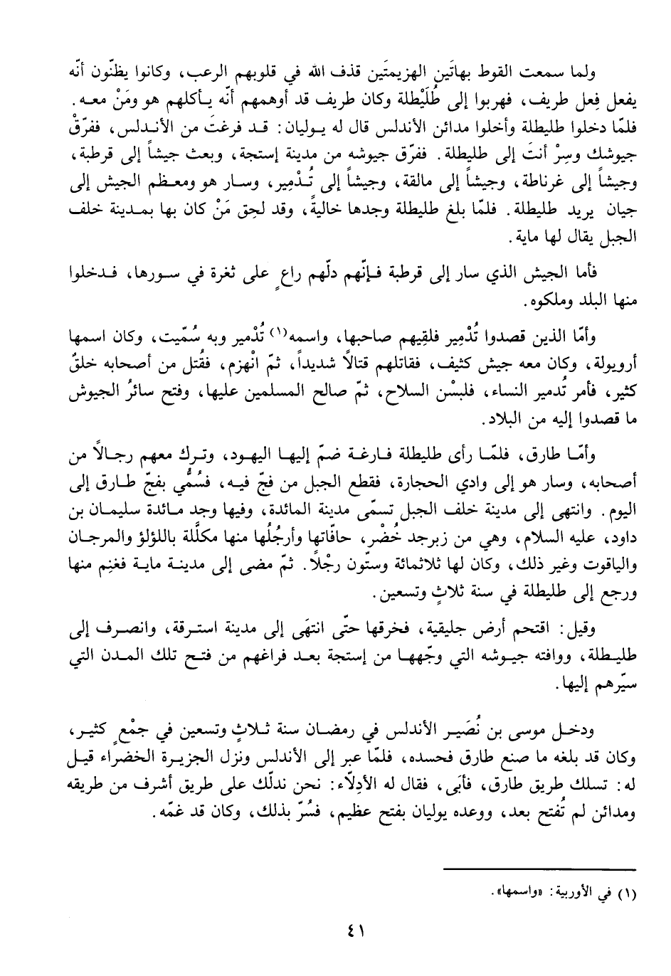 وَأَمَّا طَارِقٌ، فَلَمَّا رَأَى طُلَيْطِلَةَ فَارِغَةً ضَمَّ إِلَيْهَا الْيَهُودَ، وَتَرَكَ مَعَهُمْ رِجَالًا مِنْ أَصْحَابِهِ، وَسَارَ هُوَ إِلَى وَادِي الْحِجَارَةِ، فَقَطَعَ الْجَبَلَ مِنْ فَجٍّ فِيهِ، فَسُمِّيَ بِفَجِّ طَارِقٍ إِلَى الْيَوْمِ. وَانْتَهَى إِلَى مَدِينَةٍ خَلْفَ الْجَبَلِ تُسَمَّى مَدِينَةَ الْمَائِدَةِ، وَفِيهَا وَجَدَ مَائِدَةَ سُلَيْمَانَ بْنِ دَاوُدَ، عَلَيْهِ السَّلَامُ، وَهِيَ مِنْ زَبَرْجَدٍ خُضْرٍ، حَافَّاتُهَا وَأَرْجُلُهَا مِنْهَا مُكَلَّلَةٌ بِاللُّؤْلُؤِ وَالْمَرْجَانِ وَالْيَاقُوتِ وَغَيْرِ ذَلِكَ، وَكَانَ لَهَا ثَلَاثُمِائَةٍ وَسِتُّونَ رِجْلًا. ثُمَّ مَضَى إِلَى مَدِينَةِ مَايَةَ، فَغَنِمَ مِنْهَا وَرَجَعَ إِلَى طُلَيْطِلَةَ فِي سَنَةِ ثَلَاثٍ وَتِسْعِينَ.