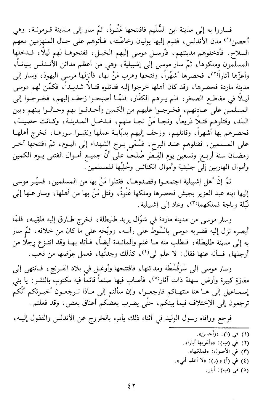 فَسَارُوا بِهِ إِلَى مَدِينَةِ ابْنِ السُّلَيْمِ فَافْتَتَحَهَا عَنْوَةً، ثُمَّ سَارَ إِلَى مَدِينَةِ قَرْمُونَةَ، وَهِيَ أَحْصَنُ مُدُنِ الْأَنْدَلُسِ، فَقَدِمَ إِلَيْهَا يُولْيَانُ وَخَاصَّتُهُ، فَأَتَوْهُمْ عَلَى حَالِ الْمُنْهَزِمِينَ مَعَهُمُ السِّلَاحُ، فَأَدْخَلُوهُمْ مَدِينَتَهُمْ، فَأَرْسَلَ مُوسَى إِلَيْهِمُ الْخَيْلَ، فَفَتَحُوهَا لَهُمْ لَيْلًا، فَدَخَلَهَا الْمُسْلِمُونَ وَمَلَكُوهَا، ثُمَّ سَارَ مُوسَى إِلَى إِشْبِيلِيَّةَ، وَهِيَ مِنْ أَعْظَمِ مَدَائِنِ الْأَنْدَلُسِ بُنْيَانًا وَأَعَزِّهَا آثَارًا، فَحَصَرَهَا أَشْهُرًا، وَفَتَحَهَا وَهَرَبَ مَنْ بِهَا، فَأَنْزَلَهَا مُوسَى الْيَهُودَ، وَسَارَ إِلَى مَدِينَةٍ مَارِدَةَ فَحَصَرَهَا، وَقَدْ كَانَ أَهْلُهَا خَرَجُوا إِلَيْهِ فَقَاتَلُوهُ قِتَالًا شَدِيدًا، فَكَمِنَ لَهُمْ مُوسَى لَيْلًا فِي مَقَاطِعِ الصَّخْرِ، فَلَمْ يَرَهُمُ الْكُفَّارُ، فَلَمَّا أَصْبَحُوا زَحَفَ إِلَيْهِمْ، فَخَرَجُوا إِلَى الْمُسْلِمِينَ عَلَى عَادَتِهِمْ، فَخَرَجُوا عَلَيْهِمْ مِنَ الْكَمِينِ وَأَحْدَقُوا بِهِمْ، وَحَالُوا بَيْنَهُمْ وَبَيْنَ الْبَلَدِ، وَقَتَلُوهُمْ قَتْلًا ذَرِيعًا، وَنَجَا مَنْ نَجَا مِنْهُمْ، فَدَخَلَ الْمَدِينَةَ، وَكَانَتْ حَصِينَةً، فَحَصَرَهُمْ بِهَا أَشْهُرًا، وَقَاتَلَهُمْ، وَزَحَفَ إِلَيْهِمْ بِدَبَّابَةٍ عَمِلَهَا وَنَقَبُوا سُورَهَا، فَخَرَجَ أَهْلُهَا عَلَى الْمُسْلِمِينَ، فَقَتَلُوهُمْ عِنْدَ الْبُرْجِ، فَسَمِّي بُرْجَ الشُّهَدَاءِ إِلَى الْيَوْمِ، ثُمَّ افْتَتَحَهَا آخِرَ رَمَضَانَ سَنَةَ أَرْبَعٍ وَتِسْعِينَ يَوْمَ الْفِطْرِ صُلْحًا عَلَى أَنَّ جَمِيعَ أَمْوَالِ الْقَتْلَى يَوْمَ الْكَمِينِ وَأَمْوَالَ الْهَارِبِينَ إِلَى جِلِّيقِيَّةَ وَأَمْوَالَ الْكَنَائِسِ وَحُلِيَّهَا لِلْمُسْلِمِينَ.