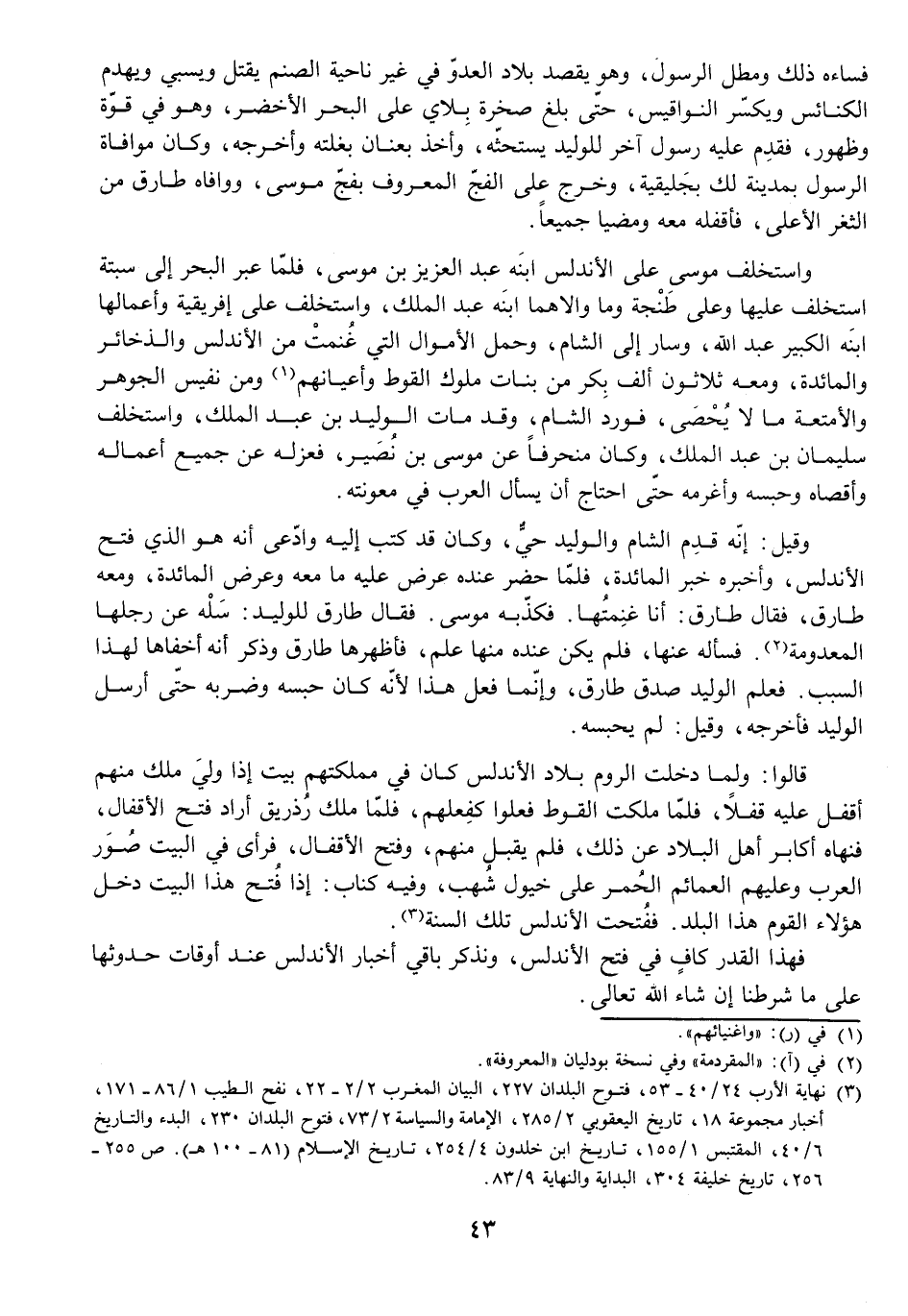 فَهَذَا الْقَدْرُ كَافٍ فِي فَتْحِ الْأَنْدَلُسِ، وَنَذْكُرُ بَاقِيَ أَخْبَارِ الْأَنْدَلُسِ عِنْدَ أَوْقَاتِ حُدُوثِهَا عَلَى مَا شَرَطْنَا إِنْ شَاءَ اللَّهُ تَعَالَى.
