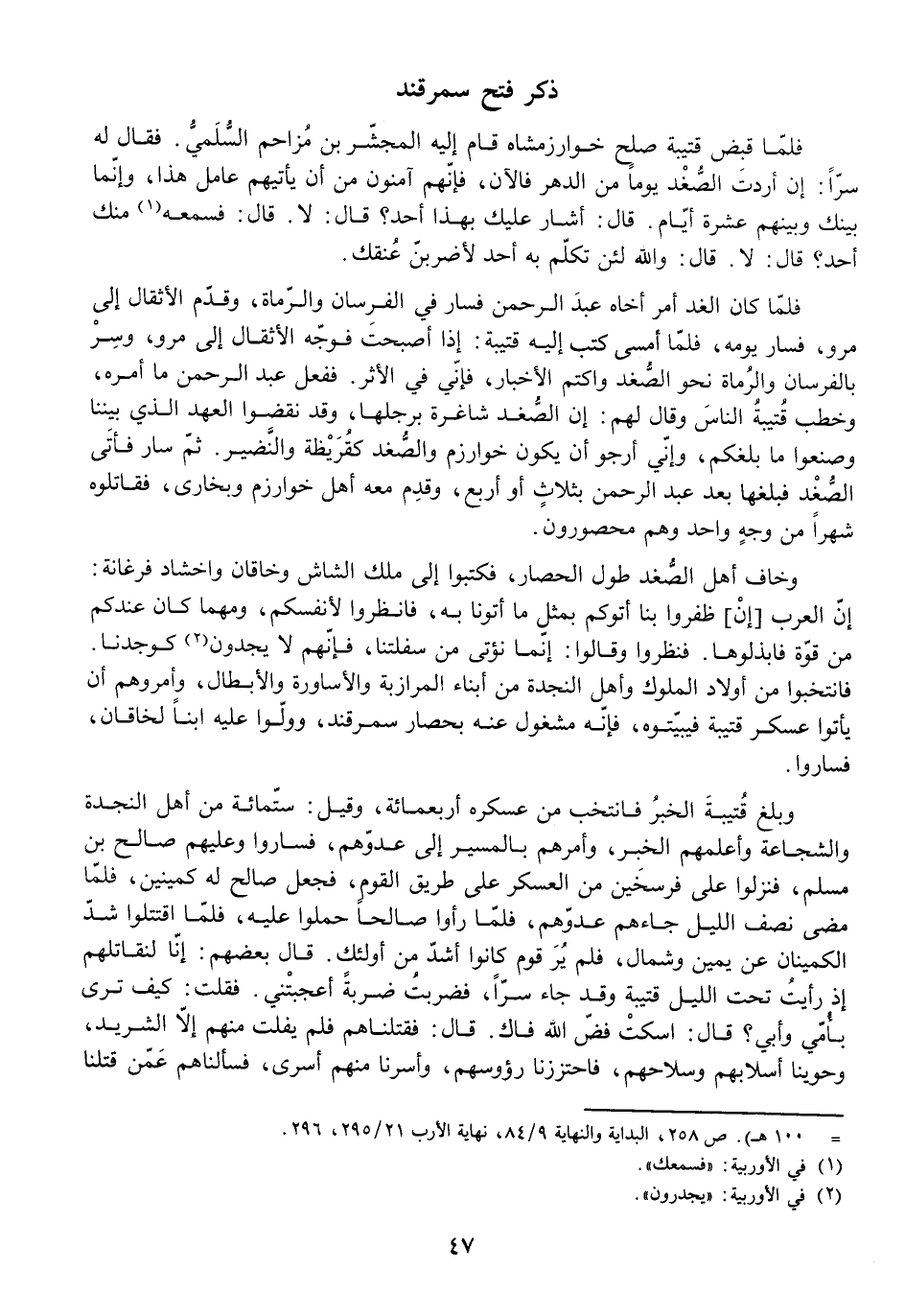 وَخَافَ أَهْلُ الصُّغْدِ طُولَ الْحِصَارِ، فَكَتَبُوا إِلَى الْمَلِكِ الشَّاشِ وَخَاقَانَ وَأَخْشَادَ فَرْغَانَةَ: إِنَّ الْعَرَبَ [إِنْ] ظَفِرُوا بِنَا أَتَوْكُمْ بِمِثْلِ مَا أَتَوْنَا بِهِ، فَانْظُرُوا لِأَنْفُسِكُمْ وَمَهْمَا كَانَ عِنْدَكُمْ مِنْ قُوَّةٍ فَابْذُلُوهَا. فَنَظَرُوا، وَقَالُوا: إِنَّمَا نُؤْتَى مِنْ سَفِلَتِنَا، فَإِنَّهُمْ لَا يَجِدُونَ كَوَجْدِنَا. فَانْتَخَبُوا مِنْ أَوْلَادِ الْمُلُوكِ وَأَهْلِ النَّجْدَةِ مِنْ أَبْنَاءِ الْمَرَازِبَةِ وَالْأَسَاوِرَةِ وَالْأَبْطَالِ، وَأَمَرُوهُمْ أَنْ يَأْتُوا عَسْكَرَ قُتَيْبَةَ فَيُبَيِّتُوهُ، فَإِنَّهُ مَشْغُولٌ عَنْهُ بِحِصَارِ سَمَرْقَنْدَ، وَوَلَّوْا عَلَيْهِ ابْنًا لِخَاقَانَ، فَسَارُوا.