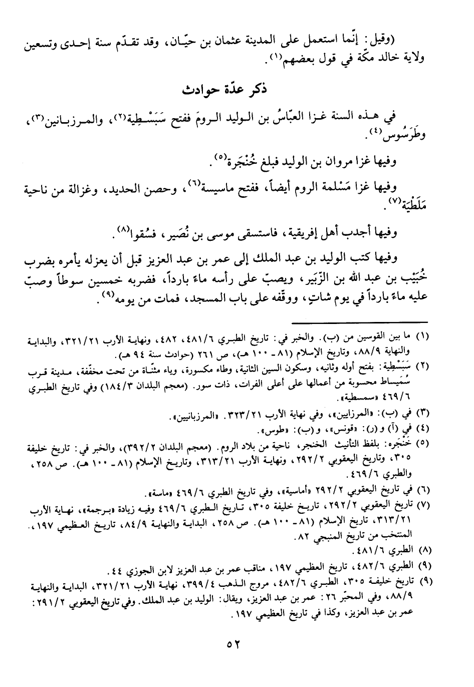 (وَقِيلَ: إِنَّمَا اسْتَعْمَلَ عَلَى الْمَدِينَةِ عُثْمَانَ بْنَ حَيَّانَ، وَقَدْ تَقَدَّمَ سَنَةَ إِحْدَى وَتِسْعِينَ وِلَايَةُ خَالِدٍ مَكَّةَ فِي قَوْلِ بَعْضِهِمْ.