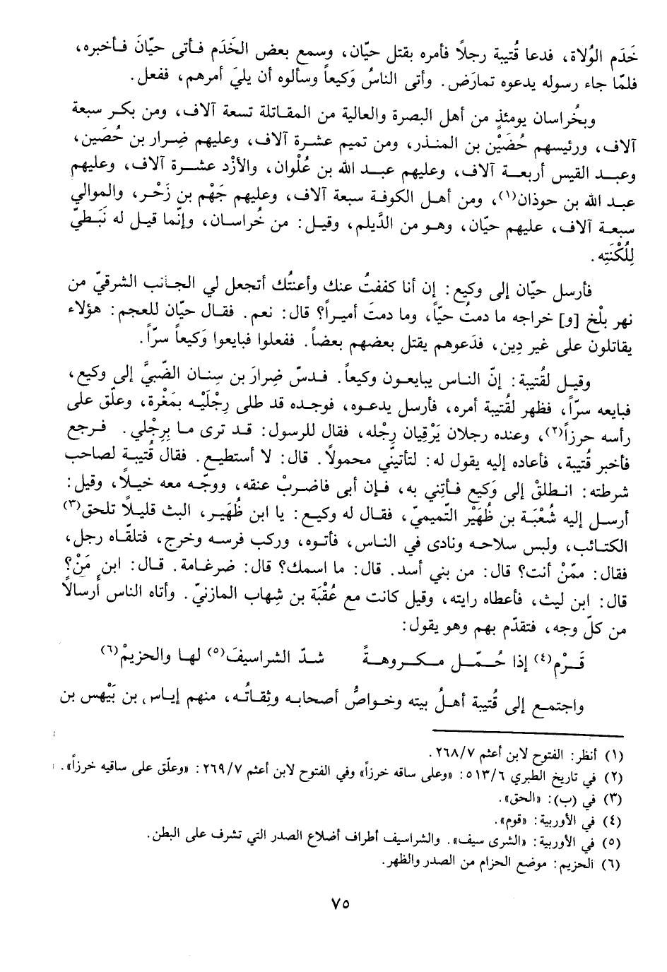 وَبِخُرَاسَانَ يَوْمَئِذٍ مِنْ أَهْلِ الْبَصْرَةِ وَالْعَالِيَةِ مِنَ الْمُقَاتِلَةِ تِسْعَةُ آلَافٍ، وَمَنْ بَكْرٍ سَبْعَةُ آلَافٍ، وَرَئِيسُهُمْ حُضَيْنُ بْنُ الْمُنْذِرِ، وَمِنْ تَمِيمٍ عَشَرَةُ آلَافٍ، وَعَلَيْهِمْ ضِرَارُ بْنُ حُصَيْنٍ، وَعَبْدُ الْقَيْسِ أَرْبَعَةُ آلَافٍ، وَعَلَيْهِمْ عَبْدُ اللَّهِ بْنُ عُلْوَانَ، وَالْأَزْدُ عَشَرَةُ آلَافٍ، وَعَلَيْهِمْ عَبْدُ اللَّهِ بْنُ حَوْذَانَ، وَمِنْ أَهْلِ الْكُوفَةِ سَبْعَةُ آلَافٍ، وَعَلَيْهِمْ جَهْمُ بْنُ زَحْرٍ، وَالْمَوَالِي سَبْعَةُ آلَافٍ، عَلَيْهِمْ حَيَّانُ، وَهُوَ مِنَ الدَّيْلَمِ، وَقِيلَ: مِنْ خُرَاسَانَ، وَإِنَّمَا قِيلَ لَهُ نَبَطِيٌّ لِلُكْنَتِهِ.