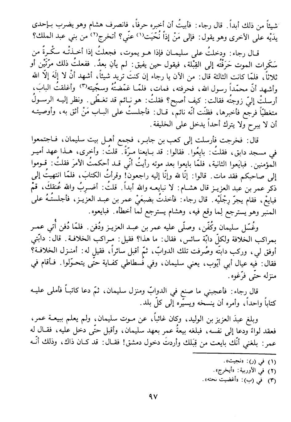 قَالَ رَجَاءٌ: وَدَخَلْتُ عَلَى سُلَيْمَانَ فَإِذَا هُوَ يَمُوتُ، فَجَعَلْتُ إِذَا أَخَذَتْهُ سَكْرَةٌ مِنْ سَكَرَاتِ الْمَوْتِ حَرَّفْتُهُ إِلَى الْقِبْلَةِ، فَيَقُولُ حِينَ يُفِيقُ: لَمْ يَأْنِ بَعْدُ. فَفَعَلْتُ ذَلِكَ مَرَّتَيْنِ أَوْ ثَلَاثًا، فَلَمَّا كَانَتِ الثَّالِثَةُ قَالَ: مِنَ الْآنَ يَا رَجَاءُ إِنْ كُنْتَ تُرِيدُ شَيْئًا، أَشْهَدُ أَنْ لَا إِلَهَ إِلَّا اللَّهُ وَأَشْهَدُ أَنَّ مُحَمَّدًا رَسُولُ اللَّهِ، فَحَرَّفْتُهُ، فَمَاتَ، فَلَمَّا غَمَّضْتُهُ وَسَجَّيْتُهُ وَأَغْلَقْتُ الْبَابَ، أَرْسَلَتْ إِلَيَّ زَوْجَتُهُ فَقَالَتْ: كَيْفَ أَصْبَحَ؟ فَقُلْتُ: هُوَ نَائِمٌ قَدْ تَغَطَّى. وَنَظَرَ إِلَيْهِ الرَّسُولُ مُتَغَطِّيًا فَرَجَعَ فَأَخْبَرَهَا، فَظَنَّتْ أَنَّهُ نَائِمٌ، قَالَ: فَأَجْلَسْتُ عَلَى الْبَابِ مَنْ أَثِقُ بِهِ، وَأَوْصَيْتُهُ أَنْ لَا يَبْرَحَ وَلَا يَتْرُكَ أَحَدًا يَدْخُلُ عَلَى الْخَلِيفَةِ.