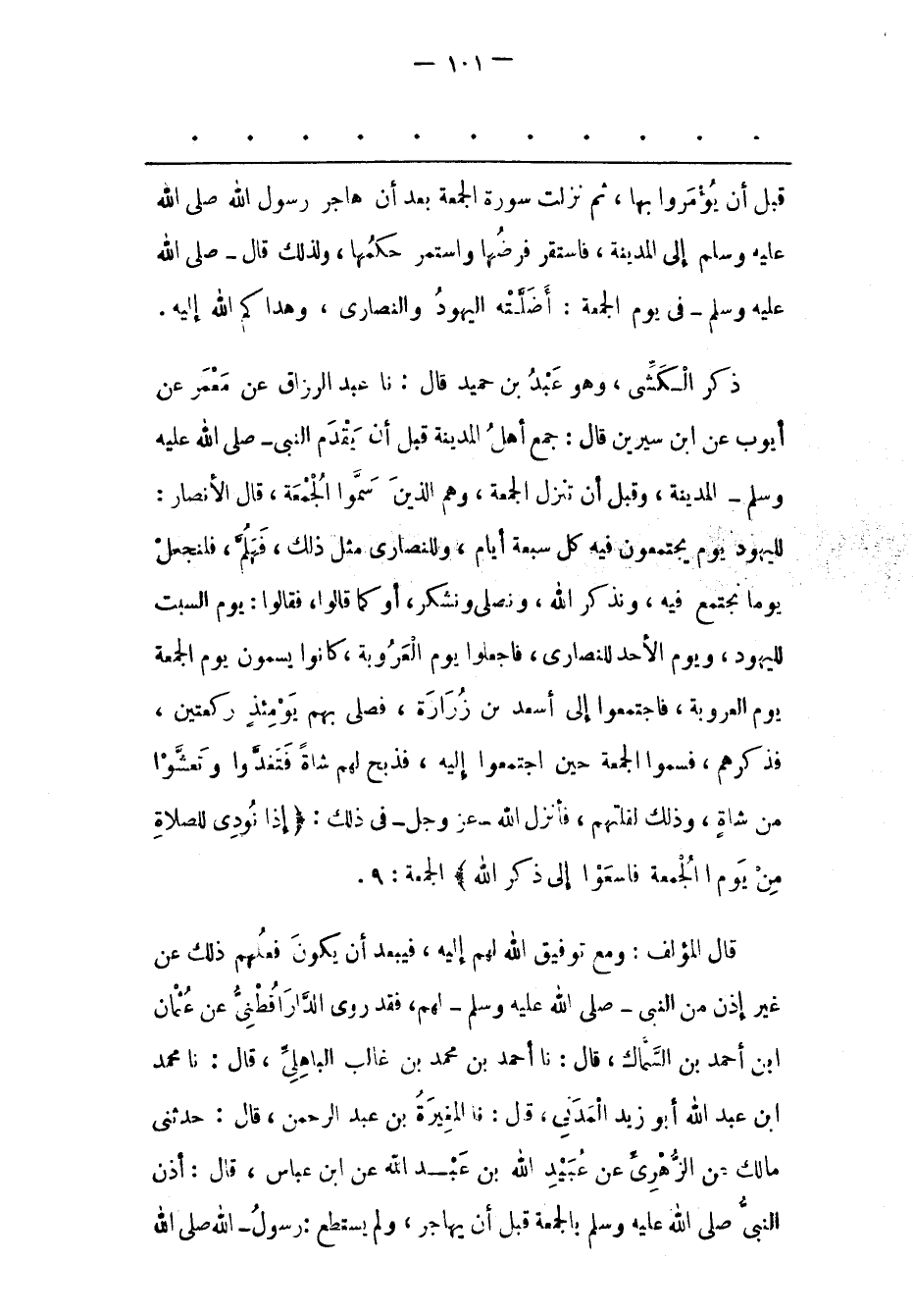 ذَكَرَ الْكَشّيّ، وَهُوَ عَبْدُ بْنِ حُمَيْدٍ قَالَ: نا عَبْدُ الرّزّاقِ عَنْ مَعْمَرٍ عَنْ أَيّوبَ عَنْ ابْنِ سِيرِينَ قَالَ: جَمّعَ أَهْلُ الْمَدِينَةِ قَبْلَ أَنْ يَقْدَمَ النّبِيّ- صَلَّى اللَّهُ عَلَيْهِ وَسَلَّمَ- الْمَدِينَةَ، وَقَبْلَ أَنْ تَنْزِلَ الْجُمُعَةُ، وَهُمْ الّذِينَ سَمّوْا الْجُمُعَةَ، قَالَ الْأَنْصَارُ: