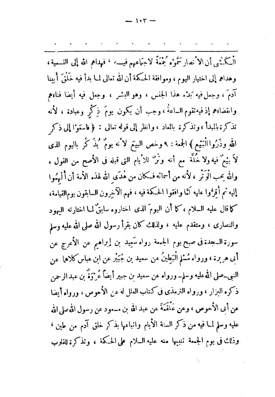الْكَشّيّ أَنّ الْأَنْصَارَ سَمّوْهُ جُمُعَةً لِاجْتِمَاعِهِمْ فِيهِ، فَهَدَاهُمْ اللهُ إلَى التّسْمِيَةِ، وَهَدَاهُمْ إلَى اخْتِيَارِ الْيَوْمِ، وَمُوَافَقَةُ الْحِكْمَةِ أَنّ اللهَ تَعَالَى لَمّا بَدَأَ فِيهِ خَلْقَ أَبِينَا آدَمَ، وَجَعَلَ فِيهِ بَدْءَ هَذَا الْجِنْسِ، وَهُوَ الْبَشَرُ، وَجَعَلَ فِيهِ أَيْضًا فَنَاءَهُمْ وَانْقِضَاءَهُمْ إذْ فِيهِ تَقُومُ السّاعَةُ، وَجَبَ أَنْ يَكُونَ يَوْمَ ذِكْرٍ وَعِبَادَةٍ، لِأَنّهُ تَذْكِرَةٌ بِالْمَبْدَأِ، وَتَذْكِرَةٌ بِالْمَعَادِ، وَانْظُرْ إلَى قَوْلِهِ تَعَالَى: فَاسْعَوْا إِلى ذِكْرِ اللَّهِ وَذَرُوا الْبَيْعَ