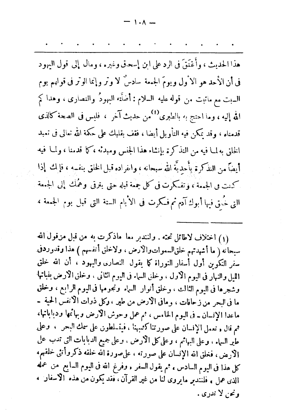 (1) اختلاف لا طائل تحته. ولنتدبر معا ما ذكرت به من قبل من قول الله سبحانه (ما أَشْهَدْتُهُمْ خَلْقَ السَّماواتِ وَالْأَرْضِ، وَلا خَلْقَ أَنْفُسِهِمْ) هذا وقد ورد فى سفر التكوين أول أسفار التوراة كما يقول النصارى واليهود، أن الله خلق الليل والنهار فى اليوم الأول، وخلق السماء فى اليوم الثانى، وخلق الأرض بنباتها وشجرها فى اليوم الثالث، وخلق أنوار السماء ونجومها فى اليوم الرابع، وخلق ما فى البحر من زحافات، وما فى الأرض من طير، وكل ذوات الأنفس الحية- ما عدا الإنسان- فى اليوم الخامس، ثم عمل وحوش الأرض وبهائمها ودباباتها، ثم قال «نعمل الإنسان على صورتنا كشبهنا، فيتسلطون على سمك البحر، وعلى طير السماء، وعلى البهائم، وعلى كل الأرض، وعلى جميع الدبابات التى تدب على الأرض، فخلق الله الإنسان على صورته، على صورة الله خلقه ذكر وأنثى خلقهم، كل هذا فى اليوم السادس، ثم يقول السفر «وفرغ الله فى اليوم السابع من عمله الذى عمل» فلنتدبر ما يروى لنا من غير القرآن، فقد يكون من هذه الأسفار ونحن لا ندرى.