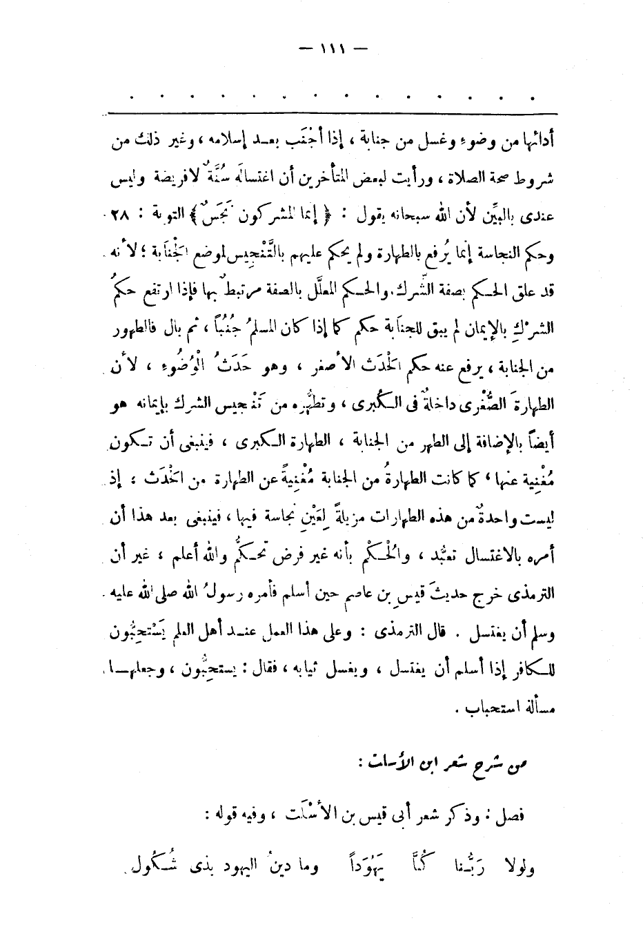 أَدَائِهَا مِنْ وُضُوءٍ وَغُسْلٍ مِنْ جَنَابَةٍ، إذَا أَجْنَبَ بَعْدَ إسْلَامِهِ، وَغَيْرُ ذَلِكَ مِنْ شُرُوطِ صِحّةِ الصّلَاةِ، وَرَأَيْت لِبَعْضِ الْمُتَأَخّرِينَ أَنّ اغتساله سنّة لا فريضة وَلَيْسَ عِنْدِي بِالْبَيّنِ لِأَنّ اللهَ سبحانه يقول: إِنَّمَا الْمُشْرِكُونَ نَجَسٌ التّوْبَةَ: 28 وَحُكْمُ النّجَاسَةِ إنّمَا يُرْفَعُ بِالطّهَارَةِ وَلَمْ يُحْكَمْ عَلَيْهِمْ بِالتّنْجِيسِ لِمَوْضِعِ الْجَنَابَةِ؛ لِأَنّهُ قَدْ عَلّقَ الْحُكْمَ بِصِفَةِ الشّرْكِ وَالْحُكْمُ الْمُعَلّلُ بِالصّفَةِ مُرْتَبِطٌ بِهَا فَإِذَا ارْتَفَعَ حُكْمُ الشّرْكِ بِالْإِيمَانِ لَمْ يَبْقَ لِلْجَنَابَةِ حُكْمٌ كَمَا إذَا كَانَ الْمُسْلِمُ جُنُبًا، ثُمّ بَالَ فَالطّهُورُ مِنْ الْجَنَابَةِ، يَرْفَعُ عَنْهُ حُكْمَ الْحَدَثِ الْأَصْغَرِ، وَهُوَ حَدَثُ الْوُضُوءِ، لِأَنّ الطّهَارَةَ الصّغْرَى دَاخِلَةٌ فِي الْكُبْرَى، وَتَطَهّرُهُ مِنْ تَنْجِيسِ الشّرْكِ بِإِيمَانِهِ هُوَ أَيْضًا بِالْإِضَافَةِ إلَى الطّهْرِ مِنْ الْجَنَابَةِ، الطّهَارَةُ الْكُبْرَى، فَيَنْبَغِي أَنْ تَكُونَ مُغْنِيَةً عَنْهَا، كَمَا كَانَتْ الطّهَارَةُ مِنْ الْجَنَابَةِ مُغْنِيَةً عَنْ الطّهَارَةِ مِنْ الْحَدَثِ، إذ لَيْسَتْ وَاحِدَةً مِنْ هَذِهِ الطّهَارَاتِ مُزِيلَةً لِعَيْنِ نَجَاسَةٍ فِيهَا، فَيَنْبَغِي بَعْدَ هَذَا أَنّ أَمْرَهُ بِالِاغْتِسَالِ تَعَبّدٌ، وَالْحُكْمُ بِأَنّهُ غَيْرُ فَرْضٍ تَحَكّمٌ وَاَللهُ أَعْلَمُ، غَيْرَ أَنّ التّرْمِذِيّ خَرّجَ حَدِيثَ قَيْسِ بْنِ عَاصِمٍ حِينَ أَسْلَمَ فَأَمَرَهُ رَسُولُ اللهِ صَلَّى اللَّهُ عَلَيْهِ وَسَلَّمَ أَنْ يَغْتَسِلَ. قَالَ التّرْمِذِيّ: وَعَلَى هَذَا الْعَمَلُ عِنْدَ أَهْلِ الْعِلْمِ يَسْتَحِبّونَ لِلْكَافِرِ إذَا أَسْلَمَ أَنْ يَغْتَسِلَ، وَيَغْسِلَ ثِيَابَهُ، فَقَالَ: يَسْتَحِبّونَ، وَجَعَلَهَا مَسْأَلَةَ اسْتِحْبَابٍ.