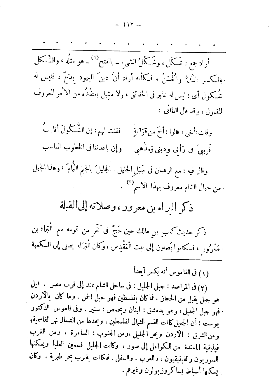 (2) فى المراصد: جبل الجليل: فى ساحل الشام ممتد إلى قرب مصر. قيل هو جبل يقبل من الحجاز، فما كان بفلسطين فهو جبل الحمل، وما كان بالأردن فهو جبل الجليل، وهو بدمشق: لبنان وبحمص: سنير. وفى قاموس الدكتور بوست: أن الجليل كانت القسم الشمالى لفلسطين، ويحدها من الشمال نهر القاسمية، ومن الشرق: الأردن وبحر الجليل، ومن الجنوب: السامرة، ومن الغرب فينيقية الممتدة من الكوامل إلى صور، وكانت الجليل قسمين العليا ويسكنها السوريون والفينيقيون، والعرب، والسفلى، فكانت بقرب بحر طبرية، وكان يسكنها أسباط بسا كروزبولون وغيرهم.