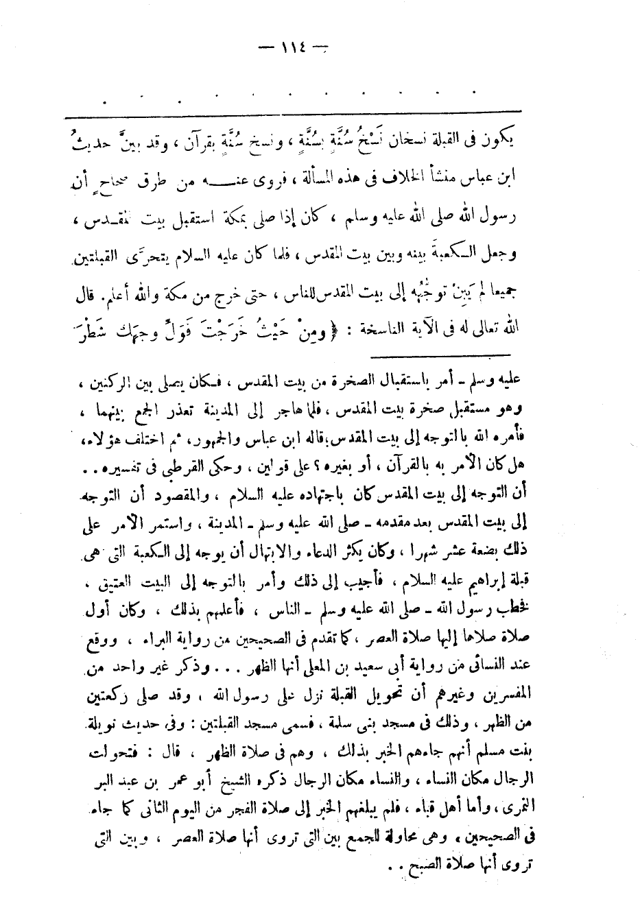يَكُونُ فِي الْقِبْلَةِ نَسْخَانِ نَسْخُ سُنّةٍ بِسُنّةِ، وَنَسْخُ سُنّةٍ بِقُرْآنِ، وَقَدْ بَيّنَ حَدِيثُ ابْنِ عَبّاسٍ مَنْشَأَ الْخِلَافِ فِي هَذِهِ الْمَسْأَلَةِ، فَرُوِيَ عَنْهُ مِنْ طُرُقٍ صِحَاحٍ أَنّ رَسُولَ اللهِ صَلَّى اللَّهُ عَلَيْهِ وَسَلَّمَ، كَانَ إذَا صَلّى بِمَكّةَ اسْتَقْبَلَ بَيْتَ الْمَقْدِسِ، وَجَعَلَ الْكَعْبَةَ بَيْنَهُ وَبَيْنَ بَيْتِ الْمَقْدِسِ، فَلَمّا كَانَ عَلَيْهِ السّلَامُ يَتَحَرّى الْقِبْلَتَيْنِ جَمِيعًا لَمْ يَبِنْ تَوَجّهُهُ إلَى بَيْتِ الْمَقْدِسِ لِلنّاسِ، حَتّى خَرَجَ مِنْ مَكّةَ وَاَللهُ أَعْلَمُ. قَالَ اللهُ تَعَالَى لَهُ فِي الْآيَةِ النّاسِخَةِ: وَمِنْ حَيْثُ خَرَجْتَ فَوَلِّ وَجْهَكَ شَطْرَ