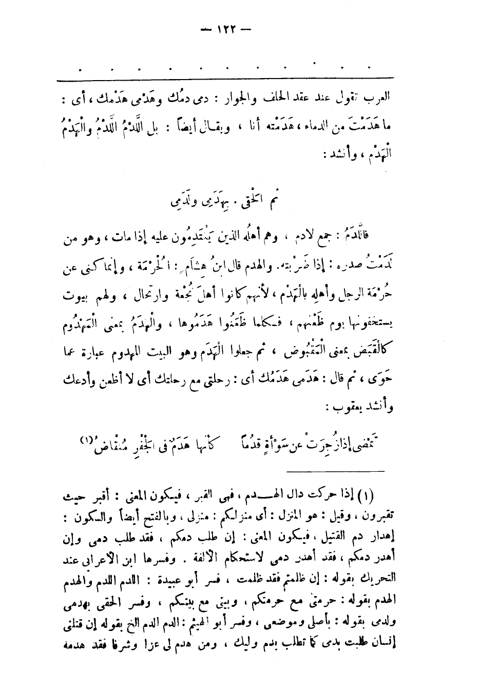 (1) إذا حركت دال الهدم، فهى القبر، فيكون المعنى: أقبر حيث تقبرون، وقيل: هو المنزل: أى منزلكم: منزلى، وبالفتح أيضا والسكون: إهدار دم القتيل، فيكون المعنى: إن طلب دمكم، فقد طلب دمى وإن أهدر دمكم، فقد أهدر دمى لاستحكام الألفة. وفسرها ابن الأعرابى عند التحريك بقوله: إن ظلمتم فقد ظلمت، فسر أبو عبيدة: اللدم اللدم والهدم الهدم بقوله: حرمتى مع حرمتكم، وبيتى مع بيتكم، وفسر الحقى بهدمى ولدمى بقوله: بأصلى وموضعى، وفسر أبو الهيثم: الدم الدم الخ بقوله إن قتلنى إنسان طلبت بدمى كما تطلب بدم وليك، ومن هدم لى عزا وشرفا فقد هدمه