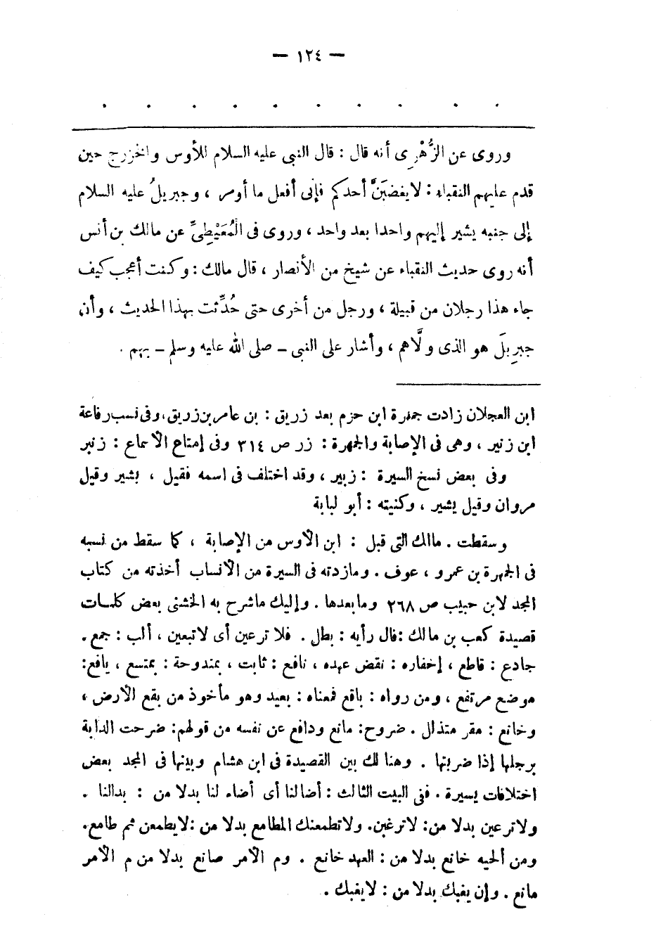 ابن العجلان زادت جمهرة ابن حزم بعد زريق: بن عامر بن زريق، وفى نسب رفاعة ابن زنير، وهى فى الإصابة والجمهرة: زر ص 314 وفى إمتاع الأسماع: زنبر وفى بعض نسخ السيرة: زبير، وقد اختلف فى اسمه فقيل، بشير وقيل مروان وقيل يشير، وكنيته: أبو لبابة وسقطت. مالك التى قبل: ابن الأوس من الإصابة، كما سقط من نسبه فى الجمهرة بن عمرو، عوف. ومازدته فى السيرة من الأنساب أخذته من كتاب المجد لابن حبيب ص 268 وما بعدها. وإليك ما شرح به الخشنى بعض كلمات قصيدة كعب بن مالك: فال رأيه: بطل. فلا ترعين أى لاتبعين، ألب: جمع. جادع: قاطع، إخفاره: نقض عهده، نافع: ثابت، بمندوحة: بمتسع، يافع: موضع مرتفع، ومن رواه: باقع فمعناه: بعيد وهو مأخوذ من بقع الأرض، وخانع: مقر متذلل. ضروح: مانع ودافع عن نفسه من قولهم: ضرحت الدابة برجلها إذا ضربتها. وهنالك بين القصيدة فى ابن هشام وبينها فى المجد بعض اختلافات يسيرة. ففى البيت الثالث: أضالنا أى أضاء لنا بدلا من: بدالنا. ولا ترعين بدلا من: لا ترغبن. ولا تطمعنك المطامع بدلا من: لا يطمعن ثم طامع. ومن ألحيه خانع بدلا من: العهد خانع. وم الأمر صانع بدلا من م الأمر مانع. وإن يغبك بدلا من: لا يغبك.