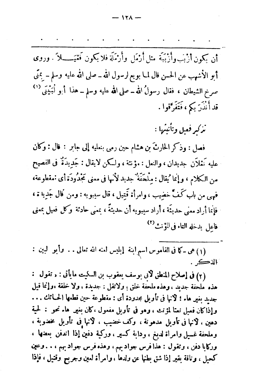(2) فى إصلاح المنطق لأبى يوسف يعقوب بن السكيت ما يأتى: «تقول: هذه ملحفة جديد، وهذه ملحفة خلق؛ ولا تقل: جديدة، ولا خلقة، وإنما قيل جديد بغير هاء؛ لأنها فى تأويل مجدودة أى: مقطوعة حين قطعها الحائك ... وإذا كان فعيل نعتا لمؤنث، وهو فى تأويل مفعول، كان بغير هاء نحو: لحية دهين، لأنها فى تأويل مدهونة، وكف خضيب، لأنها فى تأويل مخضوبة، وملحفة غسيل وامراة لديغ، ودابة كسير، وركية دفين إذا اندفن بعضها، وركايا دفن، وتقول: هذا فرس جواد بهم، وهذه فرس جواد بهم، ... وعين كحيل، وناقة بقير إذا شق بطنها عن ولدها، وامرأة لعين وجريح وقتيل، فإذا