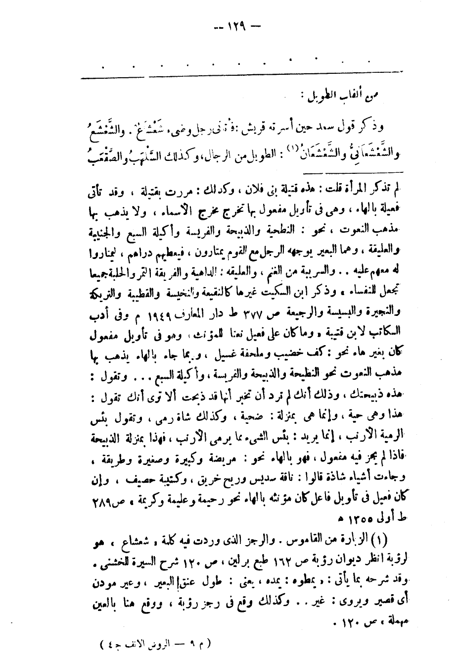 (1) الزيارة من القاموس. والرجز الذى وردت فيه كلمة «شعشاع» هو لرؤبة انظر ديوان رؤبة ص 162 طبع برلين، ص 120 شرح السيرة للخشنى. وقد شرحه بما يأتى: «يمطوه: يمده، يعنى: طول عنق البعير، وعير مودن أى قصير ويروى: غير ... وكذلك وقع فى رجز رؤبة، ووقع هنا بالعين مهملة» ص 120.