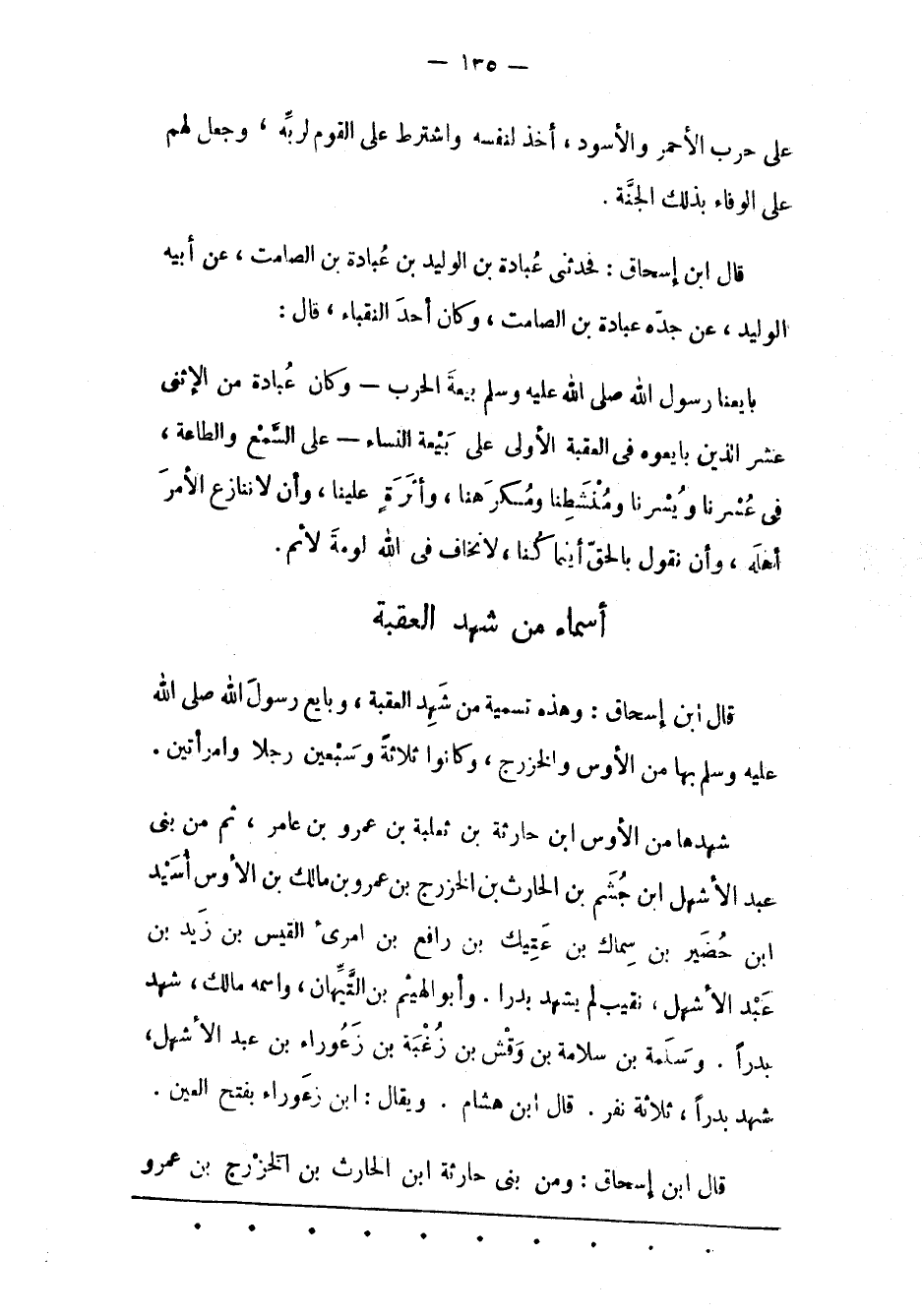 قَالَ ابْنُ إسْحَاقَ: وهذه تَسْمِيَةُ مَنْ شَهِدَ الْعَقَبَةَ، وَبَايَعَ رَسُولَ اللهِ صَلّى اللهُ عَلَيْهِ وَسَلّمَ بِهَا مِنْ الْأَوْسِ والخزرج، وكانوا ثلاثة وسبعين رجلا وامرأتين.