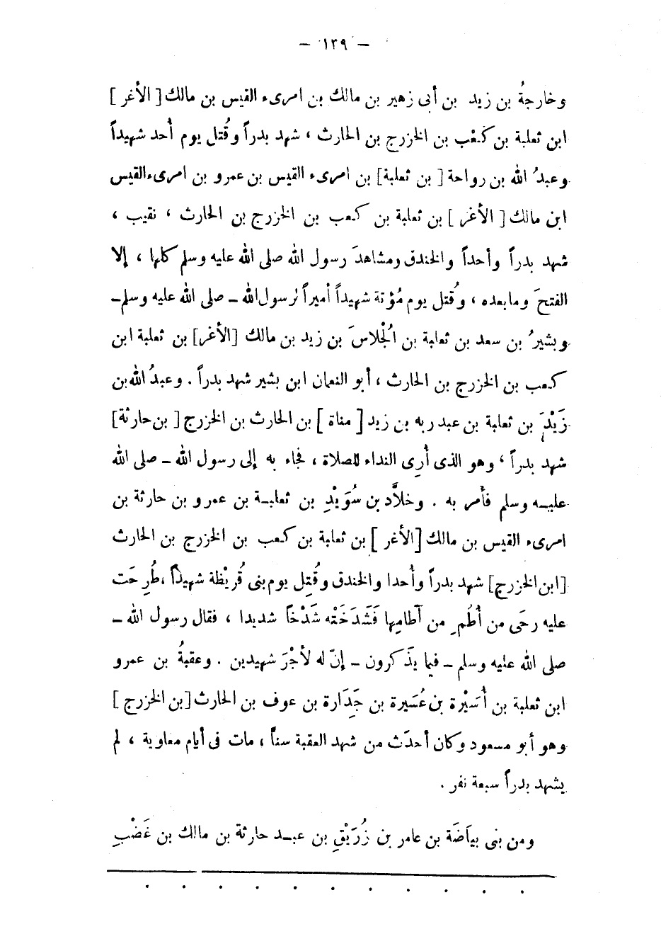 وَخَارِجَةُ بْنُ زَيْدِ بْنِ أَبِي زُهَيْرِ بْنِ مالك بن امرئ القيس بن مالك [الأغر] ابن ثَعْلَبَةَ بْنِ كَعْبِ بْنِ الْخَزْرَجِ بْنِ الْحَارِثِ، شَهِدَ بَدْرًا وَقُتِلَ يَوْمَ أُحُدٍ شَهِيدًا وَعَبْدُ اللهِ بْنُ رَوَاحَةَ [بْنِ ثَعْلَبَةَ] بْنِ امْرِئِ القيس بن عمرو بن امرئ القيس ابن مالك [الأغر] بن ثعلبة بن كعب بن الْخَزْرَجِ بْنِ الْحَارِثِ، نَقِيبٌ، شَهِدَ بَدْرًا وَأُحُدًا وَالْخَنْدَقَ وَمَشَاهِدَ رَسُولِ اللهِ صَلّى اللهُ عَلَيْهِ وَسَلّمَ كُلّهَا، إلّا الْفَتْحَ وَمَا بَعْدَهُ، وَقُتِلَ يَوْمَ مُؤْتَةَ شَهِيدًا أَمِيرًا لِرَسُولِ اللهِ- صَلّى اللهُ عَلَيْهِ وَسَلّمَ- وَبَشِيرُ بْنُ سَعْدِ بْنِ ثعلبة بن الجلاس بن زيد بن مالك [الأغر] بن ثعلبة ابن كَعْبِ بْنِ الْخَزْرَجِ بْنِ الْحَارِثِ، أَبُو النّعْمَانِ ابن بشير شهد بَدْرًا. وَعَبْدُ اللهِ بْنِ زَيْدِ بْنِ ثَعْلَبَةَ بْنِ عَبْدِ ربه بْنِ زَيْدِ [مَنَاةِ] بْنِ الْحَارِثِ بْنِ الْخَزْرَجِ [بن حارثة] شَهِدَ بَدْرًا، وَهُوَ الّذِي أُرِيَ النّدَاءَ لِلصّلَاةِ، فَجَاءَ بِهِ إلَى رَسُولِ اللهِ- صَلَّى اللَّهُ عَلَيْهِ وَسَلَّمَ فَأَمَرَ بِهِ. وَخَلّادُ بْنُ سُوِيدِ بْنِ ثَعْلَبَةَ بْنِ عَمْرِو بْنِ حَارِثَةَ بْنِ امرئ القيس بن مالك [الأغر] بن ثعلبة بن كعب بن الخزرج بن الحارث [ابن الْخَزْرَجِ] شَهِدَ بَدْرًا وَأُحُدًا وَالْخَنْدَقَ وَقُتِلَ يَوْمَ بَنِي قُرَيْظَةَ شَهِيدًا، طُرِحَتْ عَلَيْهِ رَحَى مِنْ أُطُمٍ مِنْ أُطَامِهَا فَشَدَخَتْهُ شَدْخًا شَدِيدًا، فَقَالَ رَسُولُ اللهِ- صَلَّى اللَّهُ عَلَيْهِ وَسَلَّمَ- فيما يَذْكُرُونَ- إنّ لَهُ لَأَجْرَ شَهِيدَيْنِ. وَعُقْبَةُ بْنُ عمرو ابن ثَعْلَبَةَ بْنِ أَسِيرَةَ بْنِ عُسَيْرة بْنِ جَدَارَةَ بْنِ عَوْفِ بْنِ الْحَارِثِ [بْنِ الْخَزْرَجِ] وَهُوَ أَبُو مَسْعُودٍ وَكَانَ أَحْدَثَ مَنْ شَهِدَ الْعَقَبَةَ سِنّا، مَاتَ فِي أَيّامِ مُعَاوِيَةَ، لَمْ يَشْهَدْ بدرا سبعة نَفَرٍ.