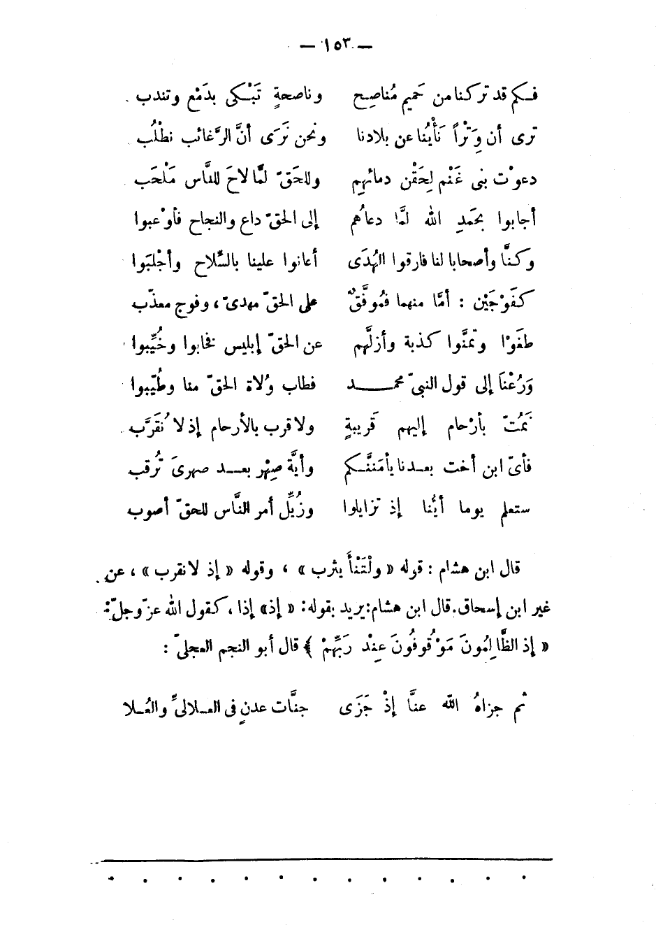 قَالَ ابْنُ هِشَامٍ: قَوْلُهُ «وَلْتَنْأَ يَثْرِبَ» ، وَقَوْلُهُ «إذْ لَا نَقْرَبُ» ، عَنْ غَيْرِ ابْنِ إسْحَاقَ. قَالَ ابْنُ هِشَامٍ: يُرِيدُ بِقَوْلِهِ: «إذْ» إذَا، كَقَوْلِ اللهِ عَزّ وَجَلّ: