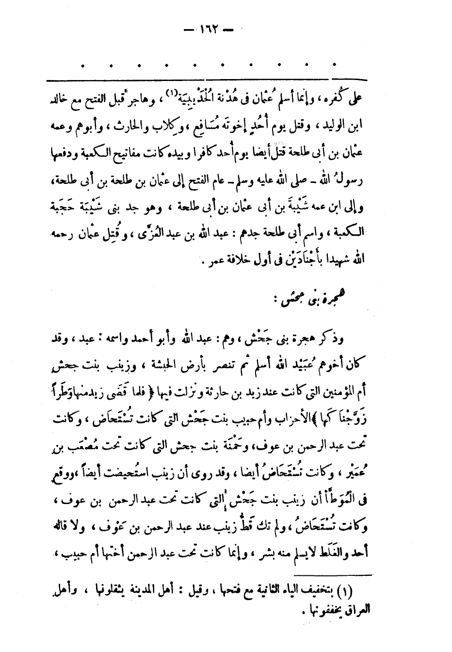 وَذَكَرَ هِجْرَةَ بَنِي جَحْشٍ، وَهُمْ: عَبْدُ اللهِ وَأَبُو أَحْمَدَ وَاسْمُهُ: عَبْدٌ، وَقَدْ كَانَ أَخُوهُمْ عُبَيْدُ اللهِ أَسْلَمَ ثُمّ تَنَصّرَ بِأَرْضِ الْحَبَشَةِ، وَزَيْنَبُ بِنْتُ جَحْشٍ أُمّ الْمُؤْمِنِينَ الّتِي كَانَتْ عِنْدَ زَيْدِ بْنِ حَارِثَةَ وَنَزَلَتْ فِيهَا فَلَمَّا قَضى زَيْدٌ مِنْها وَطَراً زَوَّجْناكَها الْأَحْزَابَ وَأُمّ حَبِيبِ بِنْتُ جَحْشٍ الّتِي كَانَتْ تُسْتَحَاضُ، وَكَانَتْ تَحْتَ عَبْدِ الرّحْمَنِ بْنِ عَوْفٍ، وَحَمْنَةُ بِنْتُ جَحْشٍ الّتِي كَانَتْ تَحْتَ مُصْعَبِ بْنِ عُمَيْرٍ، وَكَانَتْ تُسْتَحَاضُ أَيْضًا، وَقَدْ رُوِيَ أَنّ زَيْنَبَ اُسْتُحِيضَتْ أَيْضًا، وَوَقَعَ فِي الْمُوَطّأِ أَنّ زَيْنَبَ بِنْتَ جَحْشٍ الّتِي كَانَتْ تَحْتَ عَبْدِ الرّحْمَنِ بْنِ عَوْفٍ، وَكَانَتْ تُسْتَحَاضُ، وَلَمْ تَكُ قَطّ زَيْنَبُ عِنْدَ عَبْدِ الرّحْمَنِ بْنِ عَوْفٍ، وَلَا قَالَهُ أَحَدٌ وَالْغَلَطُ لَا يَسْلَمُ مِنْهُ بَشَرٌ، وَإِنّمَا كَانَتْ تَحْتَ عَبْدِ الرّحْمَنِ أُخْتُهَا أُمّ حبيب،