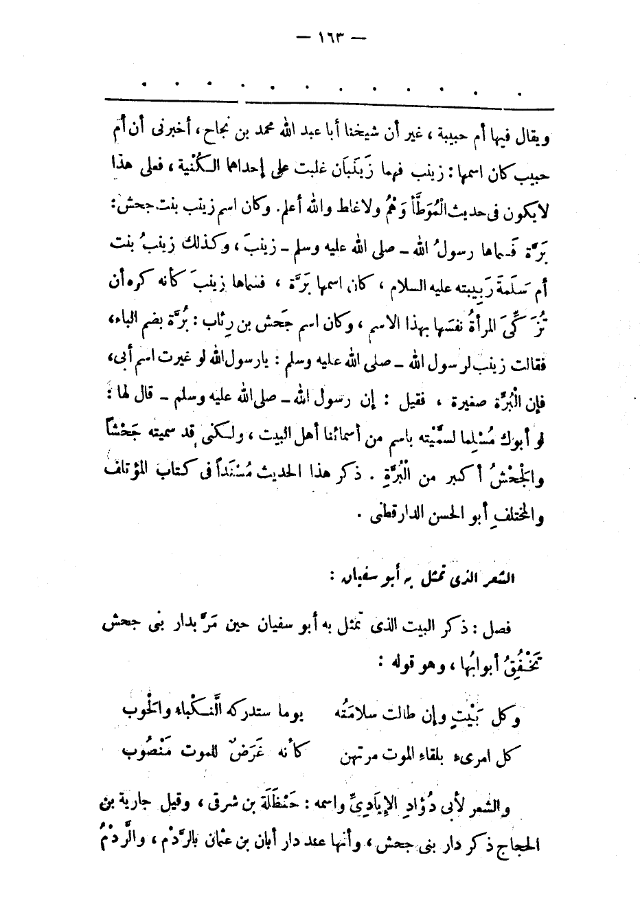 بَرّةَ فَسَمّاهَا رَسُولُ اللهِ- صَلَّى اللَّهُ عَلَيْهِ وَسَلَّمَ- زَيْنَبَ، وَكَذَلِكَ زَيْنَبُ بِنْتُ أُمّ سلمة ربيبته عليه السلام، كان اسمها برة، فَسَمّاهَا زَيْنَبَ كَأَنّهُ كَرِهَ أَنْ تُزَكّيَ الْمَرْأَةُ نَفْسَهَا بِهَذَا الِاسْمِ، وَكَانَ اسْمُ جَحْشِ بْنِ رِئَابٍ: بُرّةَ بِضَمّ الْبَاءِ، فَقَالَتْ زَيْنَبُ لِرَسُولِ اللهِ- صَلَّى اللَّهُ عَلَيْهِ وَسَلَّمَ: يَا رَسُولَ اللهِ لَوْ غَيّرْت اسْمَ أَبِي، فَإِنّ الْبُرّةَ صَغِيرَةٌ، فَقِيلَ: أن رَسُولَ اللهِ- صَلَّى اللَّهُ عَلَيْهِ وَسَلَّمَ- قَالَ لَهَا: