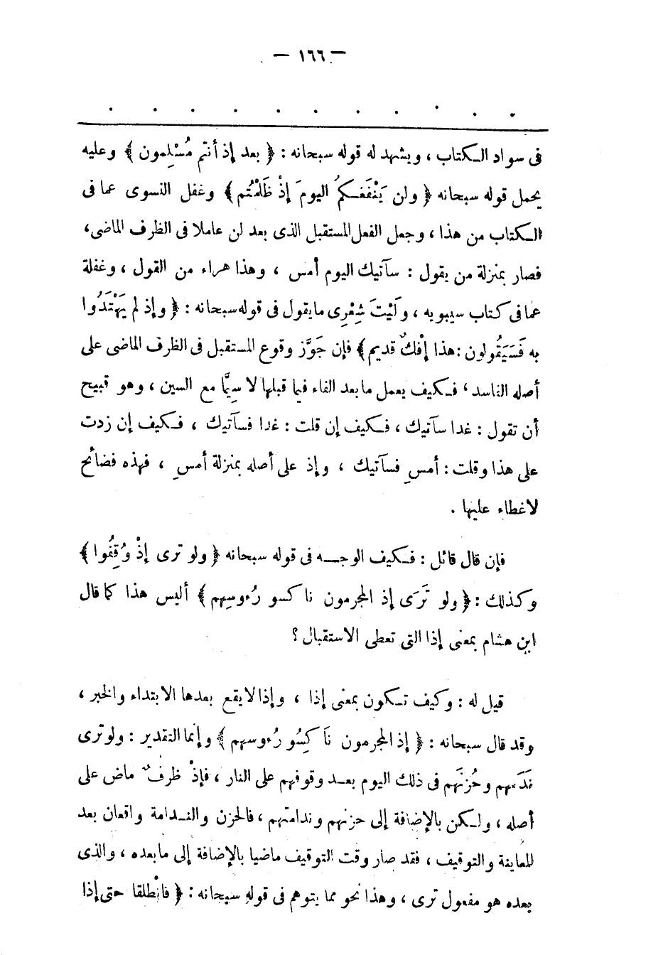 فِي سَوَادِ الْكِتَابِ، وَيَشْهَدُ لَهُ قَوْلُهُ سُبْحَانَهُ: بَعْدَ إِذْ أَنْتُمْ مُسْلِمُونَ وَعَلَيْهِ يُحْمَلُ قَوْلُهُ سُبْحَانَهُ وَلَنْ يَنْفَعَكُمُ الْيَوْمَ إِذْ ظَلَمْتُمْ وَغَفَلَ النّسَوِيّ عَمّا فِي الْكِتَابِ مِنْ هَذَا، وَجَعَلَ الْفِعْلَ الْمُسْتَقْبَلَ الّذِي بَعْدَ لَنْ عَامِلًا فِي الظّرْفِ الْمَاضِي، فَصَارَ بِمَنْزِلَةِ مَنْ يَقُولُ: سَآتِيك الْيَوْمَ أَمْسِ، وَهَذَا هُرَاءٌ مِنْ الْقَوْلِ، وَغَفْلَةٌ عَمّا فِي كِتَابِ سِيبَوَيْهِ، وَلَيْتَ شِعْرِي مَا يَقُولُ فِي قَوْلِهِ سُبْحَانَهُ: وَإِذْ لَمْ يَهْتَدُوا بِهِ فَسَيَقُولُونَ: هذا إِفْكٌ قَدِيمٌ فَإِنْ جَوّزَ وُقُوعَ الْمُسْتَقْبَلِ فِي الظّرْفِ الْمَاضِي عَلَى أَصْلِهِ الْفَاسِدِ، فَكَيْفَ يَعْمَلُ مَا بَعْدَ الْفَاءِ فِيمَا قَبْلَهَا لَا سِيّمَا مَعَ السّينِ، وهو قبيح أن تقول: غدا سآتيك، فكيف إن قُلْت: غَدًا فَسَآتِيك، فَكَيْفَ إنْ زِدْت عَلَى هَذَا وَقُلْت: أَمْسِ فَسَآتِيك، وَإِذْ عَلَى أَصْلِهِ بِمَنْزِلَةِ أَمْسِ، فَهَذِهِ فَضَائِحُ لَا غِطَاءَ عَلَيْهَا.
