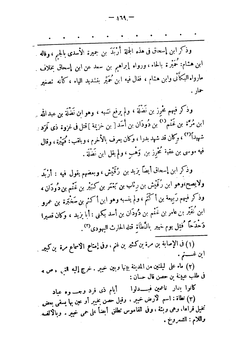 وَذَكَرَ فِيهِمْ مُحْرِزُ بْنُ نَضْلَةَ، وَلَمْ يَرْفَعْ نَسَبَهُ، وَهُوَ ابْنُ نَضْلَةَ بن عبد الله ابن مُرّةَ بْنِ غَنْمِ «1» بْنِ دُودَانَ بْنِ أَسَدِ [بْنِ خُزَيْمَةَ] قُتِلَ فِي غَزْوَةِ ذِي قَرَدٍ شَهِيدًا «2» ، وَكَانَ قَدْ شَهِدَ بَدْرًا، وَكَانَ يُعْرَفُ بِالْأَخْرَمِ، وَيُلَقّبُ: فُهَيْرَةَ، وَقَالَ فِيهِ مُوسَى بْنُ عقبة مُحْرِزِ بْنِ وَهْبٍ، وَلَمْ يَقُلْ ابْنَ نَضْلَةَ.