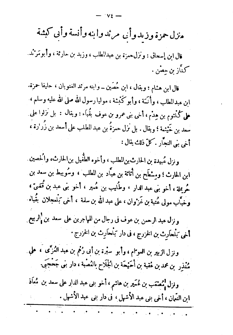 قَالَ ابْنُ هِشَامٍ: وَيُقَالُ، ابْنُ حُصَيْنٍ- وَابْنُهُ مَرْثَدٌ الْغَنَوِيّانِ، حَلِيفَا حمزة ابن عَبْدِ الْمُطّلِبِ، وَأَنَسَةُ، وَأَبُو كَبْشَةَ، مَوْلِيّا رَسُولِ اللهِ صَلّى اللهُ عَلَيْهِ وَسَلّمَ، عَلَى كُلْثُومِ بْنِ هِدْمٍ، أَخِي بَنِي عَمْرِو بْنِ عَوْفٍ بقُباءٍ: وَيُقَال: بَلْ نَزَلُوا عَلَى سَعْدِ بْنِ خَيْثمةَ؛ وَيُقَالُ. بَلْ نَزَلَ حَمْزَةُ بْنُ عَبْدِ الْمُطّلِبِ عَلَى أَسْعَدِ بْنِ زُرَارَةَ، أَخِي بَنِي النجّار. كلّ ذلك يقال: