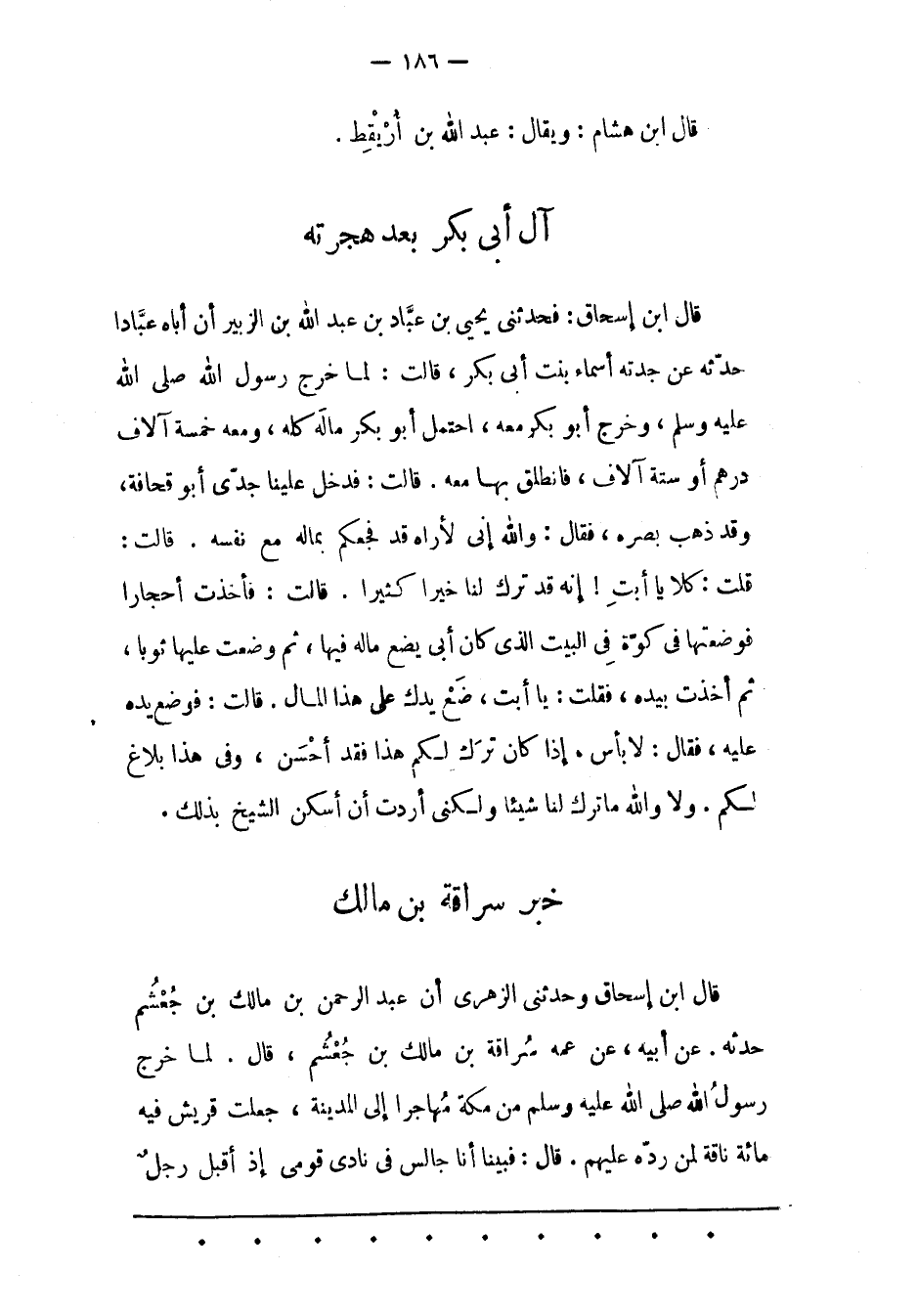 قَالَ ابْنُ إسْحَاقَ وَحَدّثَنِي الزّهْرِيّ أَنّ عَبْدَ الرّحْمَنِ بْنَ مَالِكِ بْنِ جُعْشُمٍ حَدّثَهُ. عَنْ أَبِيهِ، عَنْ عَمّهِ سُرَاقَةَ بْنِ مَالِكِ بْنِ جُعْشُمٍ، قَالَ. لَمّا خَرَجَ رَسُولُ اللهِ صَلَّى اللَّهُ عَلَيْهِ وَسَلَّمَ مِنْ مَكّةَ مُهَاجِرًا إلَى المدينة، جعلت قريش فيه مائة نَاقَةٍ لِمَنْ رَدّهُ عَلَيْهِمْ. قَالَ: فَبَيْنَا أَنَا جَالِسٌ فِي نَادِي قَوْمِي إذْ أَقْبَلَ رَجُلٌ