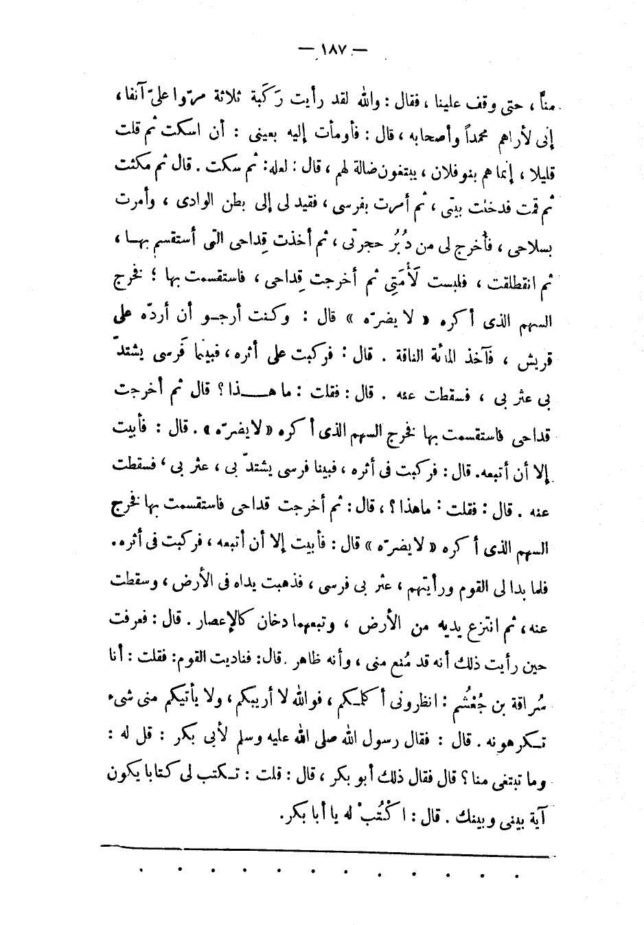 مِنّا، حَتّى وَقَفَ عَلَيْنَا، فَقَالَ: وَاَللهِ لَقَدْ رَأَيْت رَكْبَهُ ثَلَاثَةً مَرّوا عَلَيّ آنِفًا، إنّي لَأَرَاهُمْ مُحَمّدًا وَأَصْحَابَهُ، قَالَ: فَأَوْمَأْت إلَيْهِ بِعَيْنِي: أن اسكت ثم قلت قليلا، إنّمَا هُمْ بَنُو فُلَانٍ، يَبْتَغُونَ ضَالّةً لَهُمْ، قَالَ: لَعَلّهُ: ثُمّ سَكَتَ. قَالَ ثُمّ مَكَثْت ثُمّ قُمْت فَدَخَلْت بَيْتِي، ثُمّ أَمَرْت بِفَرَسِي، فَقُيّدَ لِي إلَى بَطْنِ الْوَادِي، وَأَمَرْت بِسِلَاحِي، فَأُخْرِجَ لِي مِنْ دُبُرِ حُجْرَتِي، ثُمّ أَخَذْت قداحى التى أستقسم بها، ثم انقطلقت، فَلَبِسْت لَأْمَتِي ثُمّ أَخَرَجْت قِدَاحِي، فَاسْتَقْسَمْت بِهَا؛ فَخَرَجَ السّهْمُ الّذِي أَكْرَهُ «لَا يَضُرّهُ» قَالَ: وَكُنْت أَرْجُو أَنْ أَرُدّهُ عَلَى قُرَيْشٍ، فَآخُذَ المائة النّاقَةِ. قَالَ: فَرَكِبْت عَلَى أَثَرِهِ، فَبَيْنَمَا فَرَسِي يَشْتَدّ بِي عَثَرَ بِي، فَسَقَطْت عَنْهُ. قَالَ: فَقُلْت: مَا هَذَا؟ قَالَ ثُمّ أَخَرَجْت قِدَاحِي فَاسْتَقْسَمْت بِهَا فَخَرَجَ السّهْمُ الّذِي أَكْرَهُ «لَا يَضُرّهُ» . قَالَ: فَأَبَيْت إلّا أَنْ أَتّبِعَهُ. قَالَ: فَرَكِبْت فِي أَثَرِهِ، فَبَيْنَا فَرَسِي يَشْتَدّ بِي، عَثَرَ بِي، فَسَقَطْت عَنْهُ. قَالَ: فَقُلْت: مَا هَذَا؟، قَالَ: ثُمّ أَخَرَجْت قِدَاحِي فَاسْتَقْسَمْت بِهَا فَخَرَجَ السّهْمُ الّذِي أَكْرَهُ «لَا يَضُرّهُ» قَالَ: فَأَبَيْت إلّا أَنْ أَتّبِعَهُ، فَرَكِبْت فِي أَثَرِهِ.