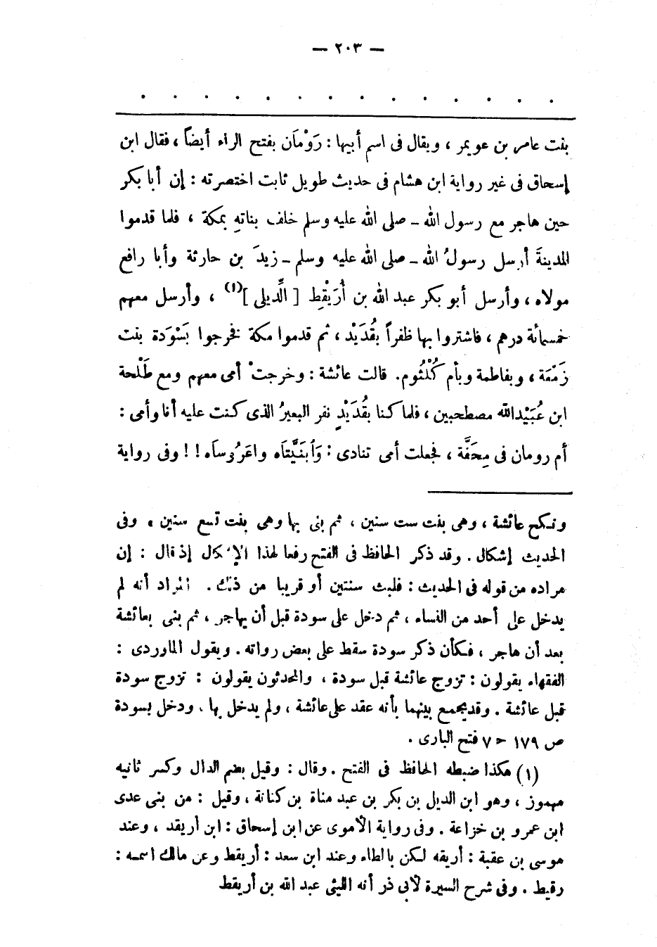 بِنْتِ عَامِرِ بْنِ عُوَيْمِرٍ، وَيُقَالُ فِي اسْمِ أَبِيهَا: رَوْمَانُ بِفَتْحِ الرّاءِ أَيْضًا، فَقَالَ ابْنُ إسْحَاقَ فِي غَيْرِ رِوَايَةِ ابْنِ هِشَامٍ فِي حَدِيثٍ طَوِيلٍ ثَابِتٍ اخْتَصَرْته: إنّ أَبَا بَكْرٍ حِينَ هَاجَرَ مَعَ رَسُولِ اللهِ- صَلَّى اللَّهُ عَلَيْهِ وَسَلَّمَ خَلّفَ بَنَاتِهِ بِمَكّةَ، فَلَمّا قَدِمُوا الْمَدِينَةَ أَرْسَلَ رَسُولُ اللهِ- صَلَّى اللَّهُ عَلَيْهِ وَسَلَّمَ- زَيْدَ بْنَ حَارِثَةَ وَأَبَا رَافِعٍ مَوْلَاهُ، وَأَرْسَلَ أَبُو بَكْرٍ عَبْدَ الله بْنَ أُرَيْقِطٍ [الدّيلِيّ] «1» ، وَأَرْسَلَ مَعَهُمْ خَمْسَمِائَةِ دِرْهَمٍ، فَاشْتَرَوْا بِهَا ظَفَرًا بِقُدَيْدٍ، ثُمّ قَدِمُوا مَكّةَ فَخَرَجُوا بِسَوْدَةِ بِنْتِ زَمْعَةَ، وَبِفَاطِمَةَ وَبِأُمّ كُلْثُومٍ. قَالَتْ عَائِشَةُ: وخرجت أمى معهم ومع طلحة ابن عُبَيْدِ اللهِ مُصْطَحِبِينَ، فَلَمّا كُنّا بِقُدَيْدٍ نَفَرَ الْبَعِيرُ الّذِي كُنْت عَلَيْهِ أَنَا وَأُمّي: