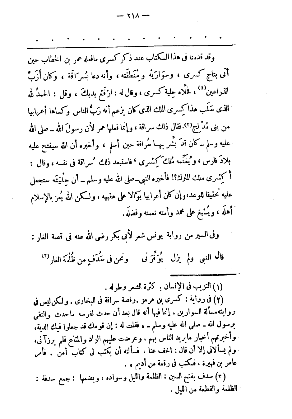 (2) فى رواية: كسرى بن هرمز. وقصة سراقة فى البخارى. ولكن ليس فى روايته مسألة السوارين، إنما فيها أنه قال بعد أن حدث لفرسه ما حدث والتقى برسول اللهِ- صَلّى اللهُ عَلَيْهِ وَسَلّمَ- «فَقُلْتُ لَهُ: إن قومك قد جعلوا فيك الدية، وأخبرتهم أخبار ما يريد الناس بهم، وعرضت عليهم الزاد والمتاع فلم يرزآنى، ولم يسألانى إلا أن قال: اخف عنا، فسألته أن يكتب لى كتاب أمن. فأمر عامر بن فهيرة، فكتب فى رقعة من أديم» .