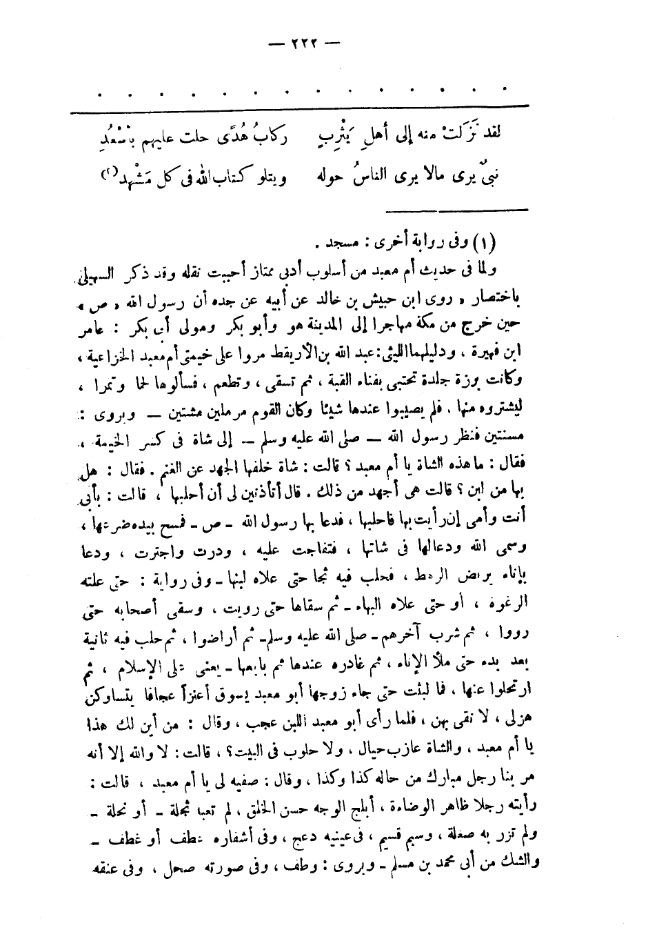 (1) وفى رواية أخرى: مسجد. ولما فى حديث أم معبد من أسلوب أدبى ممتاز أحببت نقله وقد ذكر السهيلى باختصار «روى ابن حبيش بن خالد عن أبيه عن جده أن رسول الله «ص» حين خرج من مكة مهاجرا إلى المدينة هو وأبو بكر ومولى أبى بكر: عامر ابن فهيرة، ودليلهما الليثى: عبد الله بن الأريقط مروا على خيمتى أم معبد الخزاعية، وكانت برزة جلدة تحتبى بفناء القبة، ثم تسقى، وتطعم، فسألوها لحما وتمرا، ليشتروه منها، فلم يصيبوا عندها شيئا وكان القوم مرملين مشتين- ويروى: مسنتين فنظر رسول الله- صلى الله عليه وسلم- إلى شاة فى كسر الخيمة، فقال: ما هذه الشاة يا أم معبد؟ قالت: شاة خلفها الجهد عن الغنم. فقال: هل بها من لبن؟ قالت هى أجهد من ذلك. قال أتأذنين لى أن أحلبها، قالت: بأبى أنت وأمى إن رأيت بها فاحلبها، فدعا بها رسول الله- ص- فمسح بيده ضرعها، وسمى الله ودعالها فى شاتها، فتفاجت عليه، ودرت واجترت، ودعا بإناء يربض الرمط، فحلب فيه ثجا حتى علاه لبنها- وفى رواية: حتى علته الرغوة، أو حتى علاه البهاء- ثم سقاها حتى رويت، وسقى أصحابه حتى رووا، ثم شرب آخرهم- صلى الله عليه وسلم- ثم أراضوا، ثم حلب فيه ثانية بعد بدء حتى ملأ الإناء، ثم غادره عندها ثم بايعها- يعنى على الإسلام، ثم ارتحلوا عنها، فما لبثت حتى جاء زوجها أبو معبد يسوق أعنزا عجافا يتساوكن هزلى، لا نقى يهن، فلما رأى أبو معبد اللبن عجب، وقال: من أين لك هذا يا أم معبد، والشاة عازب حيال، ولا حلوب فى البيت؟، قالت: لا والله إلا أنه مر بنا رجل مبارك من حاله كذا وكذا، وقال: صفيه لى يا أم معبد، قالت: رأيته رجلا ظاهر الوضاءة، أبلج الوجه حسن الخلق، لم تعبد ثجلة- أو نحلة- ولم تزر به صعلة، وسيم قسيم، فى عينيه دعج، وفى أشفاره عطف أو غطف- والشك من أبى محمد بن مسلم- ويروى: وطف، وفى صورته صحل، وفى عنقه