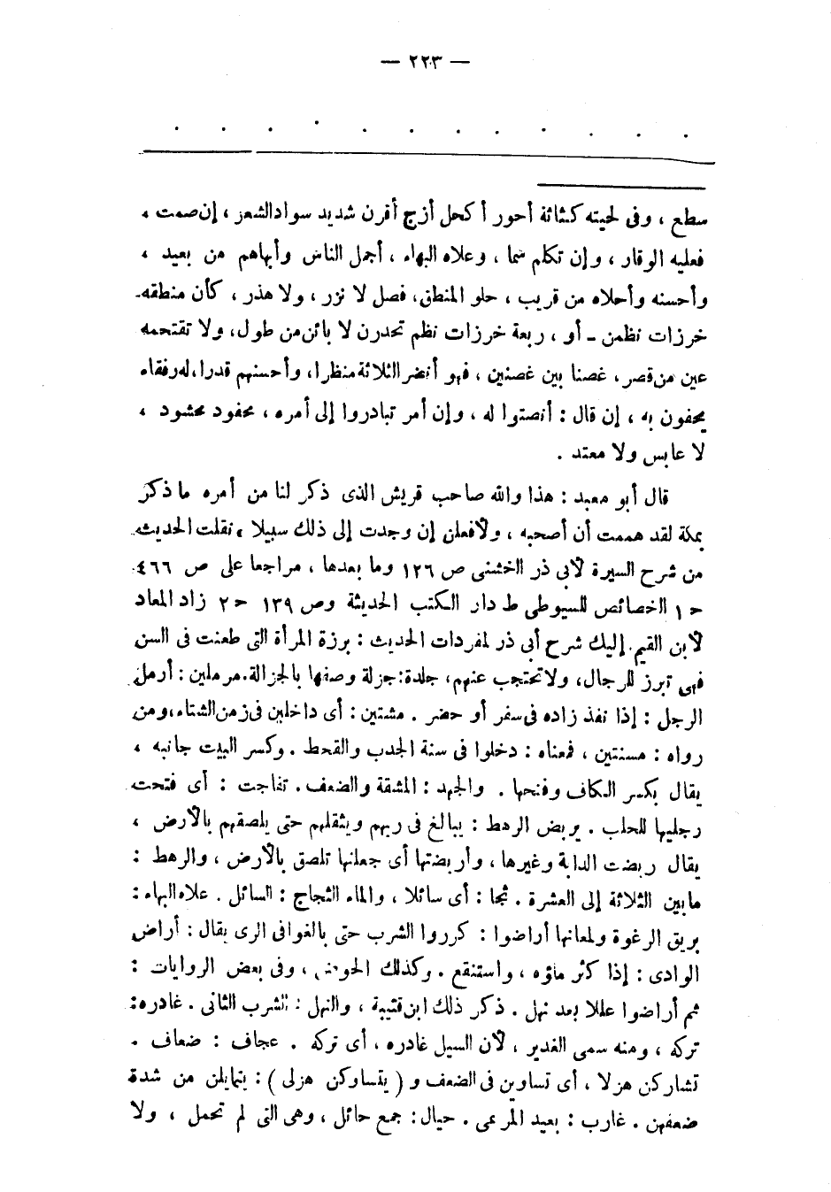 حلوب: يعنى: شاة تحلب، وقد تكون الحلوب واحدا، وقد يكون جمعا. ظاهر الوضاءة: الوضاءة: حسن الوجه. ونظافته، ومنه اشتقاق الوضوء. أبلج للوجه: مشرق الوجه، يقال تبلج الصبح إذا أشرق وأنار. لم يعبه نحله: يعنى: ضعفه وصغره، وهو من الجسم الناحل، وهو القليل اللحم. ولم يزر: لم يقصر، والصقل والصقلة: جلدة الخاصرة، تريد: أنه ناعم الجسم، ضاهر الخاصرة، وهو من الأوصاف الحسنة. وفى بعض روايات هذا الحديث: لم تعبه ثجلة. ولم يزر به صعلة، فالثجلة: عظم البطن، يقال: بطن أثجل إذا كان عظيما، والصعلة صغر الرأس، ومنه يقال للنعام: صعل. وسيم «الحسن والوضاءة الثابتة. وقسيم: كأن كل عضو من وجهه أخذ قسمة من الجمال» . الدعج: شدة سواد العين. «الأشفار: أهداب العين» فى أشفاره عطف أو غطف، ويروى: وطف الوطف: طول شعر أشفار العين، وقال صاحب كتاب العين: الغطف بالغين المعجمة مثل الوطف، وأما العطف بالعين المهملة، فلا معنى له هنا، وقد فسره بعضهم، فقال: هو أن تطول أشفار العين حتى تنعطف. صحل: الصحل: البحح، يريد: أنه ليس بحاد الصوت. فى عنقه سطع: أى: إشراف وطول، يقال: عنق سطعاء إذا أشرفت وطالت، فى لحيته كثاثة: الكثاثة: دقة نبات شعر اللحية مع استدارة فيها. أزج أقرن: الزجج: دقة شعر الحاجبين مع طولها، والقرن: أن يتصل ما بينهما بالشعر علاه البهاء: البهاء هنا: حسن الظاهر. فصل لا نزر ولا هذر: الفصل: الكلام البين، والنزر: الكلام القليل، والهذر: الكلام الكثير. وأرادت أن كلامه ليس بقليل، فينسب إلى العى، ولا بكثير فينسب إلى التزيد. لا بائن من طول: طوله ليس بمفرط لا تقتحمه عين: أى: لا تحتقره، يقال رأيت فلانا فاقتحمته عينى، أى: احتقرته أنضر الثلاثة: أى: أنعم الثلاثة من النضرة، وهو النعيم. محفود: مخدوم، والحفدة: الخدمة، ويقال: حفدت الرجل: إذا خدمته، محشود: محفوف به. قال ابن طريف: يقال: حشدت الرجل إذا أطفت به، واستشهد بلفظة محشود من هذا الحديث، ولا معتد: أى غير ظالم «أحورا أكحل: الحور بياض العين الواضح، والكحل: سواد أشفار