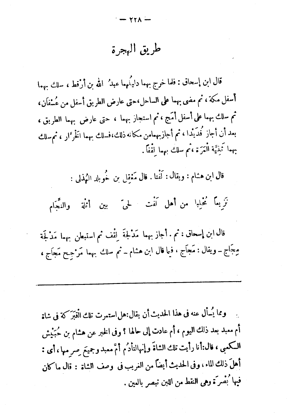 قَالَ ابْنُ إسْحَاقَ: فَلَمّا خَرَجَ بِهِمَا دَلِيلُهُمَا عَبْدُ اللهِ بْنُ أَرْقَطَ، سَلَكَ بِهِمَا أَسْفَلَ مَكّةَ، ثُمّ مَضَى بِهِمَا عَلَى السّاحِلِ، حَتّى عَارَضَ الطّرِيقَ أَسْفَلَ مِنْ عُسْفَانَ، ثُمّ سَلَكَ بِهِمَا عَلَى أَسْفَلِ أَمَجَ، ثُمّ اسْتَجَازَ بِهِمَا، حَتّى عَارَضَ بِهِمَا الطّرِيقَ، بَعْدَ أَنْ أَجَازَ قُدَيْدًا، ثُمّ أَجَازَ بِهِمَا مِنْ مَكَانِهِ ذَلِكَ، فَسَلَكَ بِهِمَا الْخَرّارَ، ثُمّ سَلَكَ بِهِمَا ثَنِيّةَ الْمَرّةِ، ثُمّ سَلَكَ بِهِمَا لِقْفا.