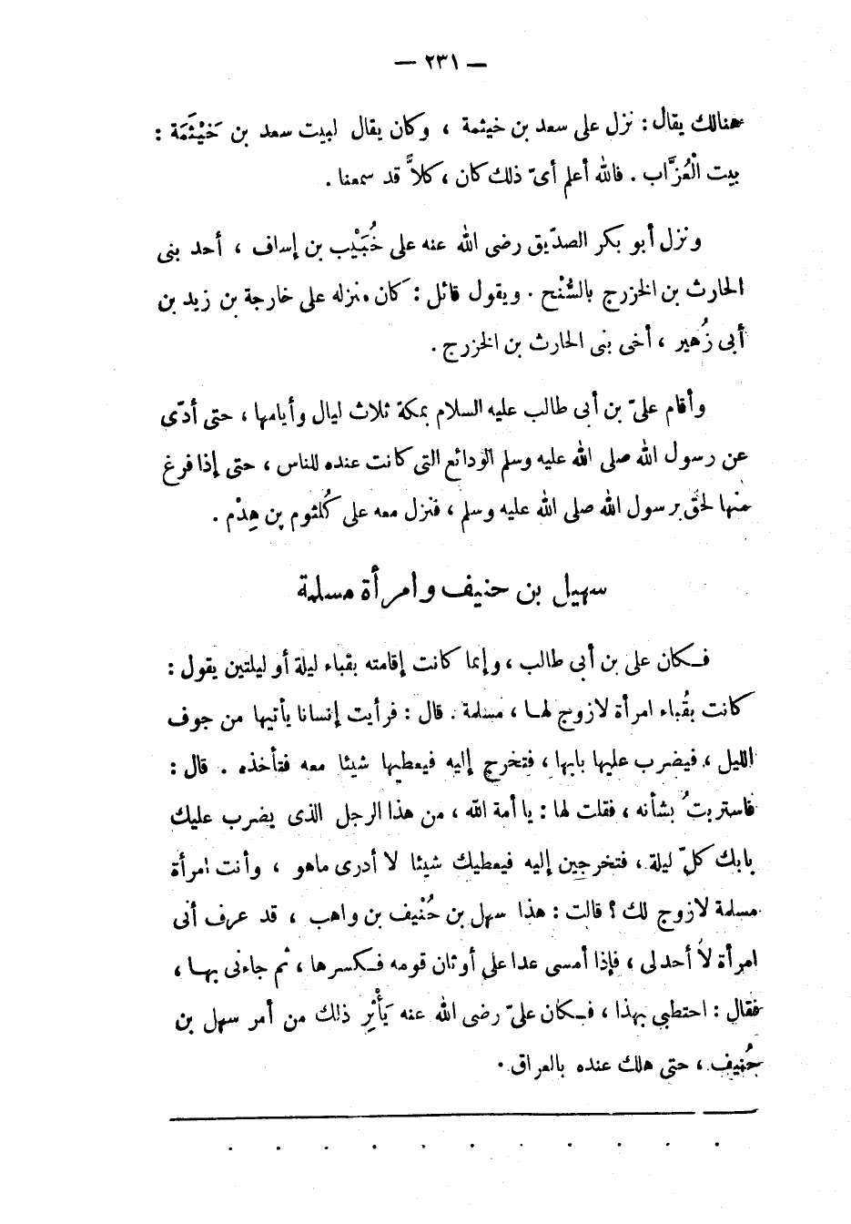 فاستربت بشأنه، فقلت لها: يا أمة الله، من هذا الرجل الذى يضرب عليك بابك كلّ ليلة، فتخرجين إليه فيعطيك شيئا لا أَدْرِي مَا هُوَ، وَأَنْتِ امْرَأَةٌ مُسْلِمَةٌ لَا زَوْجَ لَك؟ قَالَتْ: هَذَا سَهْلُ بْنُ حُنَيْفِ بْنِ وَاهِبٍ، قد عَرَفَ أَنّي امْرَأَةٌ لَا أَحَدَ لِي، فَإِذَا أَمْسَى عَدَا عَلَى أَوْثَانِ قَوْمِهِ فَكَسّرَهَا، ثُمّ جَاءَنِي بِهَا، فَقَالَ: احْتَطِبِي بِهَذَا، فَكَانَ عَلِيّ رَضِيَ اللهُ عَنْهُ يَأْثُرُ ذَلِكَ مِنْ أَمْرِ سَهْلِ بْنِ حُنَيْفٍ، حَتّى هَلَكَ عِنْدَهُ بِالْعِرَاقِ.
