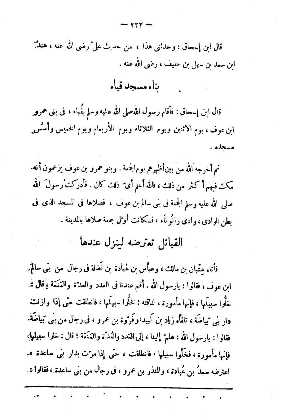 قَالَ ابْنُ إسْحَاقَ: فَأَقَامَ رَسُولُ اللهِ صَلّى اللهُ عَلَيْهِ وَسَلّمَ بقُباءٍ، فى بنى عمرو ابن عوف، يوم الاثنين ويوم الثلاثاء ويوم الأربعام ويوم الخميس وأسّس مسجده.