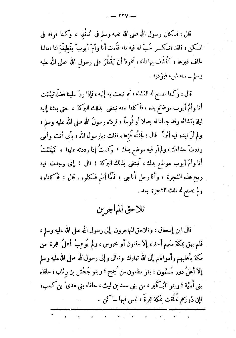 قَالَ: فَكَانَ رَسُولُ اللهِ صَلَّى اللَّهُ عَلَيْهِ وَسَلَّمَ فِي سُفْلِهِ، وَكُنّا فَوْقَهُ فِي الْمَسْكَنِ، فلقد انكسر حبّ لنا فيه ماء فقمت أنا وأمّ أيوب بقطيفة لنا، مالنا لِحَافٌ غَيْرَهَا، نُنَشّفُ بِهَا الْمَاءَ، تَخَوّفًا أَنْ يَقْطُرَ عَلَى رَسُولِ اللهِ صَلَّى اللَّهُ عَلَيْهِ وَسَلَّمَ- مِنْهُ شَيْءٌ فَيُؤْذِيَهُ.