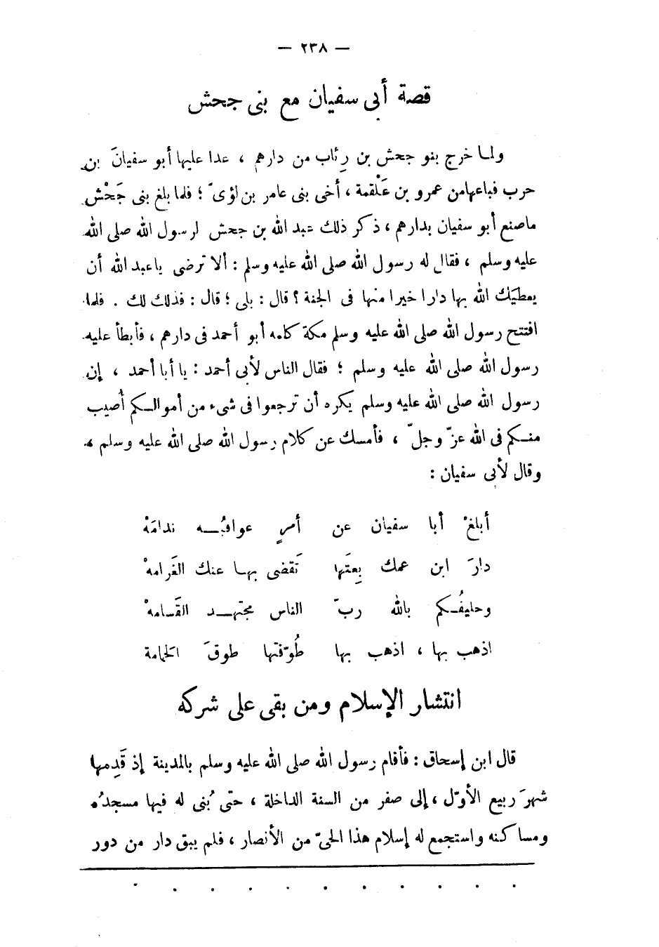 مَا صَنَعَ أَبُو سُفْيَانَ بِدَارِهِمْ، ذَكَرَ ذَلِكَ عَبْدُ اللهِ بْنُ جَحْشٍ لِرَسُولِ اللهِ صَلَّى اللَّهُ عَلَيْهِ وَسَلَّمَ، فَقَالَ لَهُ رَسُولُ اللهِ صَلّى اللهُ عَلَيْهِ وَسَلّمَ: أَلَا تَرْضَى يَا عَبْدَ اللهِ أَنْ يُعْطِيَك اللهُ بِهَا دَارًا خَيْرًا مِنْهَا فِي الْجَنّةِ؟ قَالَ: بَلَى؛ قَالَ: فذلك لك. فَلَمّا افْتَتَحَ رَسُولُ اللهِ صَلَّى اللَّهُ عَلَيْهِ وَسَلَّمَ مَكّةَ كَلّمَهُ أَبُو أَحْمَدَ فِي دَارِهِمْ، فَأَبْطَأَ عَلَيْهِ رَسُولُ اللهِ صَلّى اللهُ عَلَيْهِ وَسَلّمَ؛ فَقَالَ النّاسُ لِأَبِي أَحْمَدَ: يَا أَبَا أَحْمَدَ، إنّ رَسُولَ اللهِ صَلّى اللهُ عَلَيْهِ وَسَلّمَ يَكْرَهُ أَنْ تَرْجِعُوا فِي شَيْءٍ مِنْ أَمْوَالِكُمْ أُصِيبَ مِنْكُمْ فِي اللهِ عَزّ وَجَلّ، فَأَمْسَكَ عَنْ كَلَامِ رَسُولِ اللهِ صَلّى اللهُ عَلَيْهِ وَسَلّمَ، وَقَالَ لِأَبِي سُفْيَانَ: