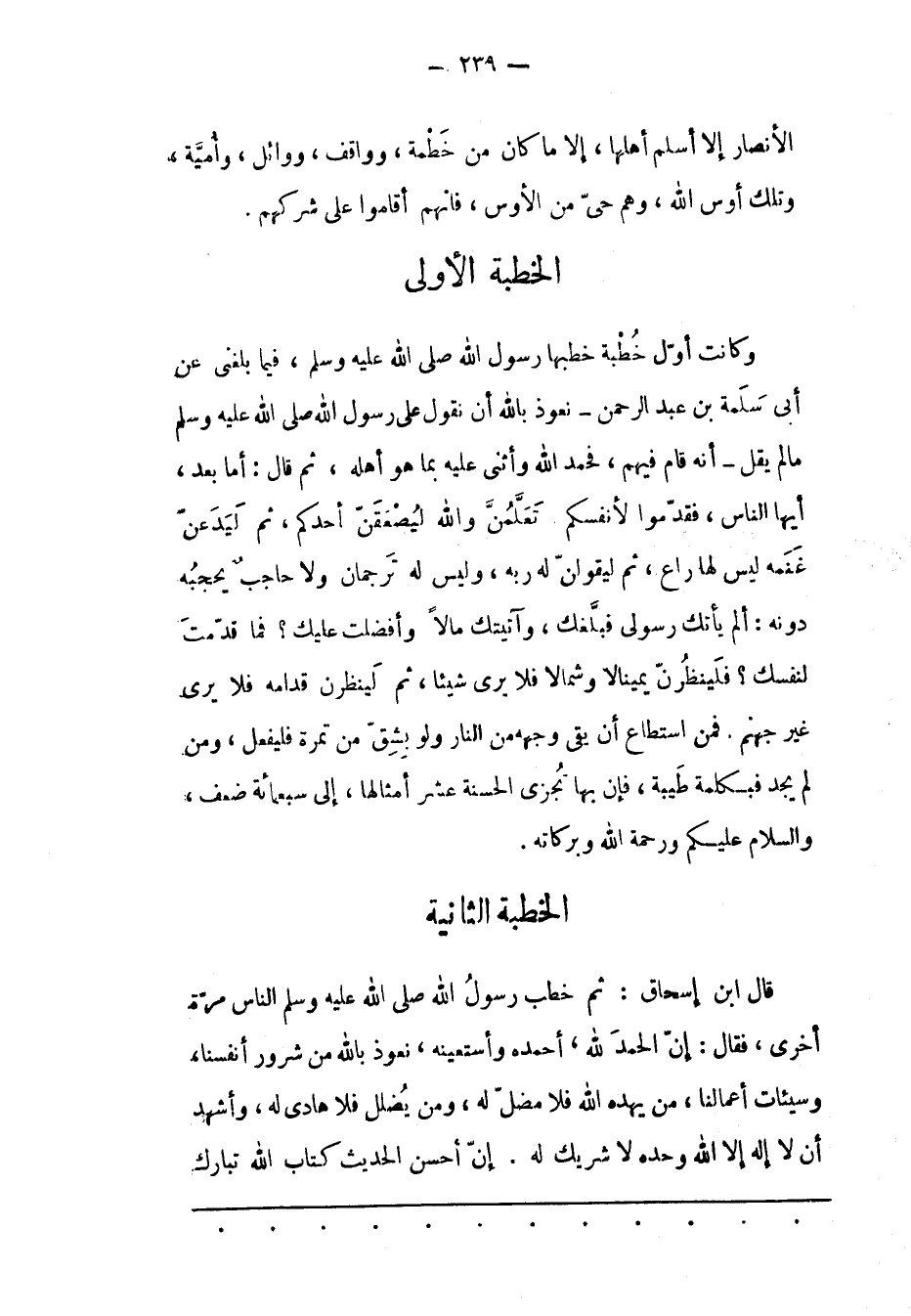 قَالَ ابْنُ إسْحَاقَ: ثُمّ خَطَبَ رَسُولُ اللهِ صَلَّى اللَّهُ عَلَيْهِ وَسَلَّمَ النّاسَ مَرّةً أُخْرَى، فَقَالَ: إنّ الْحَمْدَ لِلّهِ، أَحْمَدُهُ وَأَسْتَعِينُهُ، نَعُوذُ بِاَللهِ مِنْ شُرُورِ أَنْفُسِنَا، وَسَيّئَاتِ أَعْمَالِنَا، مَنْ يَهْدِهِ اللهُ فَلَا مُضِلّ لَهُ، وَمَنْ يُضْلِلْ فَلَا هَادِيَ لَهُ، وَأَشْهَدُ أَنْ لَا إلَهَ إلّا اللهُ وَحْدَهُ لَا شَرِيكَ لَهُ. إنّ أَحْسَنَ الْحَدِيثِ كِتَابُ اللهِ تَبَارَكَ