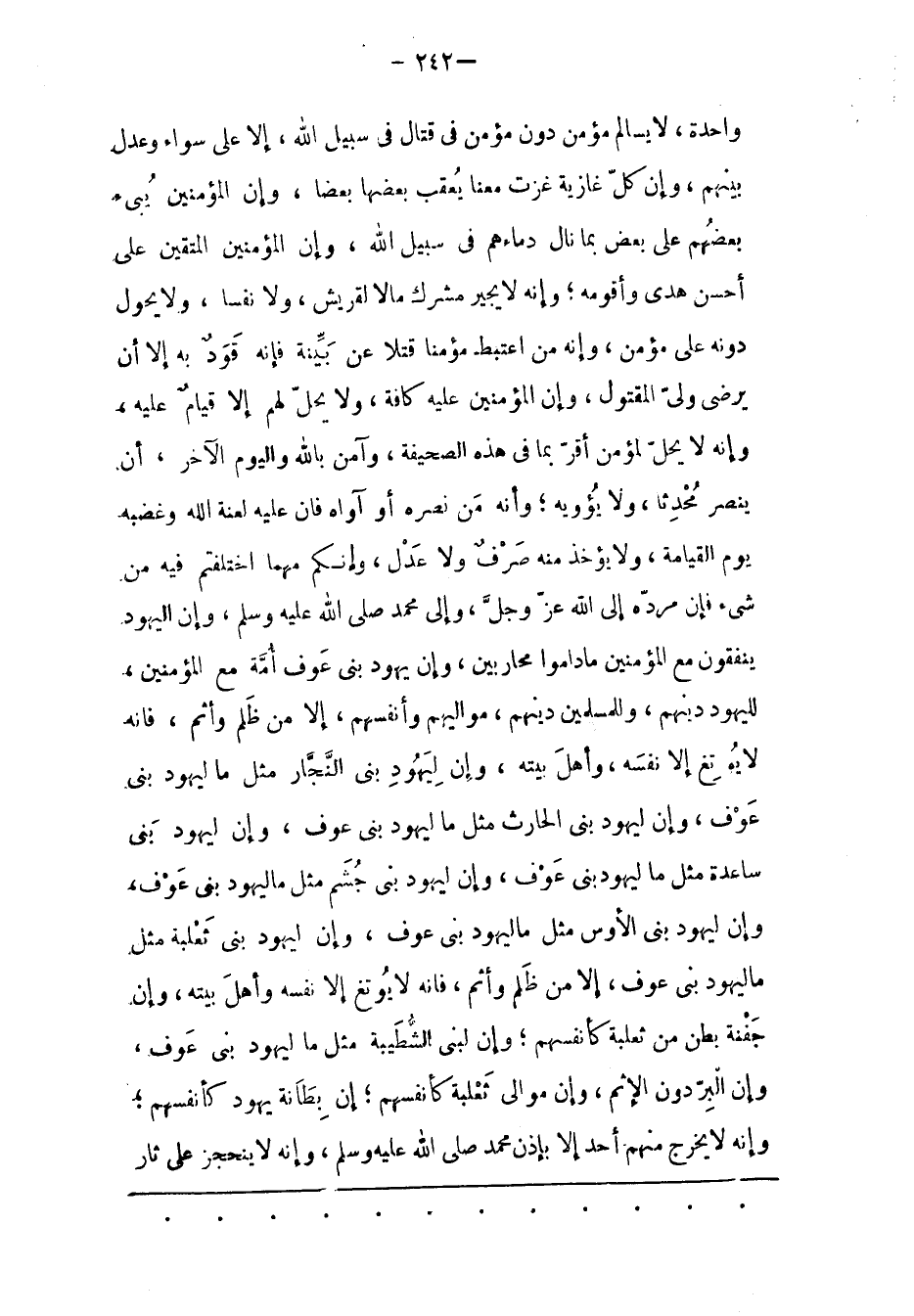 وَاحِدَةٌ، لَا يُسَالَمُ مُؤْمِنٌ دُونَ مُؤْمِنٍ فِي قِتَالٍ فِي سَبِيلِ اللهِ، إلّا عَلَى سَوَاءٍ وَعَدْلٍ بَيْنَهُمْ، وَإِنّ كُلّ غَازِيَةٍ غَزَتْ مَعَنَا يعقب بعضها بعضا، وإن المؤمنين يبىء بَعْضُهُمْ عَلَى بَعْضٍ بِمَا نَالَ دِمَاءَهُمْ فِي سَبِيلِ اللهِ، وَإِنّ الْمُؤْمِنِينَ الْمُتّقِينَ عَلَى أَحْسَنِ هدى وأقومه؛ وإنه لا يجير مشرك ما لا لقريش، ولا نفسا، وَلَا يَحُولُ دُونَهُ عَلَى مُؤْمِنٍ، وَإِنّهُ مَنْ اعْتَبَطَ مُؤْمِنًا قَتْلًا عَنْ بَيّنَةٍ فَإِنّهُ قَوَدٌ بِهِ إلّا أَنْ يَرْضَى وَلِيّ الْمَقْتُولِ، وَإِنّ الْمُؤْمِنِينَ عَلَيْهِ كَافّةٌ، وَلَا يَحِلّ لَهُمْ إلّا قِيَامٌ عَلَيْهِ، وَإِنّهُ لَا يَحِلّ لِمُؤْمِنٍ أَقَرّ بِمَا فِي هَذِهِ الصّحِيفَةِ، وَآمَنَ بِاَللهِ وَالْيَوْمِ الْآخِرِ، أَنْ يَنْصُرَ مُحْدِثًا، وَلَا يُؤْوِيهِ؛ وَأَنّهُ مَنْ نَصَرَهُ أَوْ آوَاهُ فَإِنّ عَلَيْهِ لَعْنَةَ اللهِ وَغَضَبَهُ يَوْمَ الْقِيَامَةِ، وَلَا يُؤْخَذُ مِنْهُ صَرْفٌ وَلَا عَدْلٌ، وَإِنّكُمْ مَهْمَا اخْتَلَفْتُمْ فِيهِ مِنْ شَيْءٍ فَإِنّ مَرَدّهُ إلَى اللهِ عَزّ وَجَلّ، وَإِلَى مُحَمّدٍ صَلّى اللهُ عَلَيْهِ وَسَلّمَ، وإن اليهود ينفقون مع المؤمنين ماداموا مُحَارَبِينَ، وَإِنّ يَهُودَ بَنِي عَوْفٍ أُمّةٌ مَعَ الْمُؤْمِنِينَ، لِلْيَهُودِ دِينُهُمْ، وَلِلْمُسْلِمَيْنِ دِينُهُمْ، مَوَالِيهِمْ وَأَنْفُسُهُمْ، إلّا مَنْ ظَلَمَ وَأَثِمَ، فَإِنّهُ لَا يُوتِغُ إلّا نَفْسَهُ، وَأَهْلَ بَيْتِهِ، وَإِنّ لِيَهُودِ بَنِي النّجّار مِثْلَ مَا لِيَهُودِ بَنِي عَوْفٍ، وَإِنّ لِيَهُودِ بَنِي الْحَارِثِ مِثْلَ مَا لِيَهُودِ بَنِي عَوْفٍ، وإن ليهود بنى ساعدة مِثْلَ مَا لِيَهُودِ بَنِي عَوْفٍ، وَإِنّ لِيَهُودِ بَنِي جُشَمٍ مِثْلَ مَا لِيَهُودِ بَنِي عَوْفٍ، وَإِنّ لِيَهُودِ بَنِي الْأَوْسِ مِثْلَ مَا لِيَهُودِ بنى عوف، وَإِنّ لِيَهُودِ بَنِي ثَعْلَبَةَ مِثْلَ مَا لِيَهُودِ بَنِي عَوْفٍ، إلّا مَنْ ظَلَمَ وَأَثِمَ، فَإِنّهُ لَا يُوتِغُ إلّا نَفْسَهُ وَأَهْلَ بَيْتِهِ، وَإِنّ جَفْنَةَ بَطْنٌ مِنْ ثَعْلَبَةَ كَأَنْفُسِهِمْ؛ وَإِنّ لِبَنِي الشّطِيبَةِ مِثْلَ مَا لِيَهُودِ بَنِي عَوْفٍ، وَإِنّ البّرّدون الإثم، وإن موالى ثعلبة كأنفسهم؛ إن بِطَانَةَ يَهُودَ كَأَنْفُسِهِمْ؛ وَإِنّهُ لَا يَخْرَجُ مِنْهُمْ أَحَدٌ إلّا بِإِذْنِ مُحَمّدٍ صَلّى اللهُ عَلَيْهِ وَسَلّمَ، وَإِنّهُ لَا يُنْحَجَزُ عَلَى ثَأْرٍ