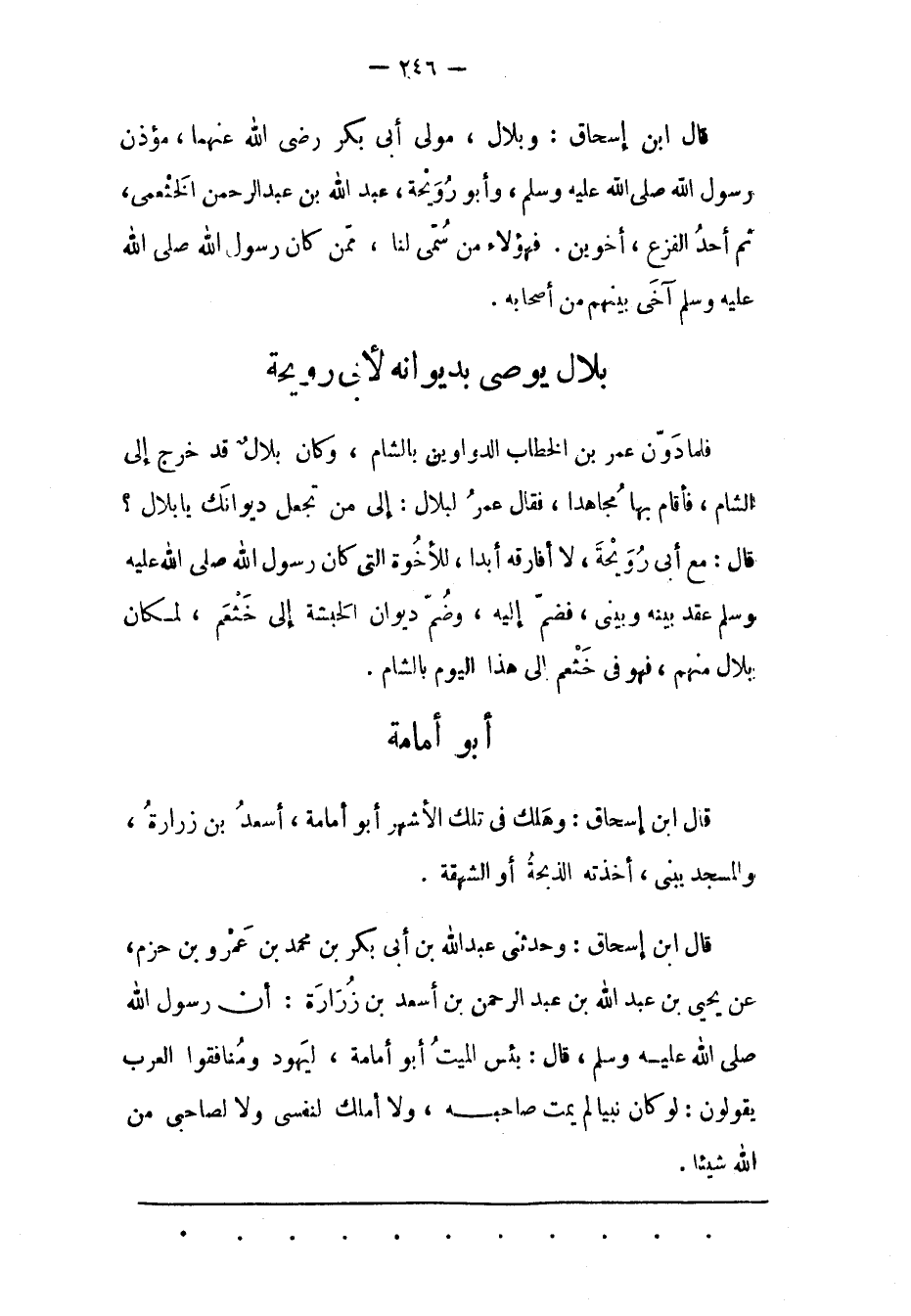 قَالَ ابْنُ إسْحَاقَ: وَبِلَالٌ، مَوْلَى أَبِي بَكْرٍ رَضِيَ اللهُ عَنْهُمَا، مُؤَذّنُ رَسُولُ اللهِ صَلَّى اللَّهُ عَلَيْهِ وَسَلَّمَ، وَأَبُو رُوَيْحَةَ، عَبْدُ اللهِ بن عبد الرحمن الخثعمى، ثم أحد الفزع، أخوين. فهؤلاء من سُمّيَ لَنَا، مِمّنْ كَانَ رَسُولُ اللهِ صَلَّى اللَّهُ عَلَيْهِ وَسَلَّمَ آخَى بَيْنَهُمْ مِنْ أَصْحَابِهِ.