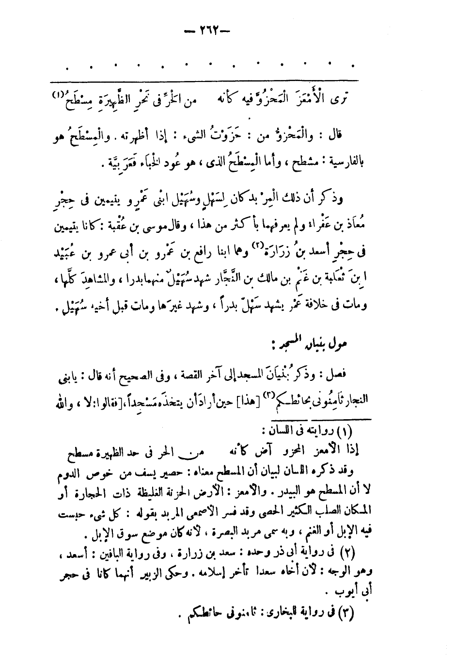 وقد ذكره اللسان لبيان أن المسطح معناه: حصير يسف من خوص الدوم لا أن المسطح هو البيدر. والأمعز: الأرض الحزنة الغليظة ذات الحجارة أو المكان الصلب الكثير الحصى وقد فسر الأصمعى المربد بقوله: كل شىء حبست فيه الإبل أو الغنم، وبه سمى مربد البصرة، لأنه كان موضع سوق الإبل.