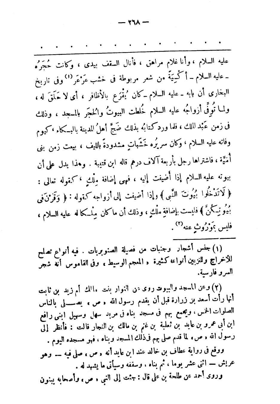 عَلَيْهِ السّلَامُ، وَأَنَا غُلَامٌ مُرَاهِقٌ، فَأَنَالُ السّقْفَ بِيَدِي، وَكَانَتْ حُجَرُهُ- عَلَيْهِ السّلَامُ- أَكْسِيَةٌ مِنْ شَعْرٍ مَرْبُوطَةٌ فِي خَشَبٍ عَرْعَرٍ «1» وَفِي تَارِيخِ الْبُخَارِيّ أَنّ بَابَهُ- عَلَيْهِ السّلَامُ- كَانَ يُقْرَعُ بِالْأَظَافِرِ، أَيْ لَا حِلَقَ لَهُ، وَلَمّا تُوُفّيَ أَزْوَاجُهُ عَلَيْهِ السّلَامُ خُلِطَتْ الْبُيُوتُ وَالْحُجَرُ بِالْمَسْجِدِ، وَذَلِكَ فِي زَمَنِ عَبْدِ الْمَلِكِ، فَلَمّا وَرَدَ كِتَابُهُ بِذَلِكَ ضَجّ أَهْلُ الْمَدِينَةِ بِالْبُكَاءِ، كَيَوْمِ وَفَاتِهِ عَلَيْهِ السّلَامُ، وَكَانَ سَرِيرُهُ خَشَبَاتٌ مَشْدُودَةٌ بِاللّيفِ، بِيعَتْ زَمَنَ بَنِي أُمَيّةَ، فَاشْتَرَاهَا رَجُلٌ بِأَرْبَعَةِ آلَافِ دِرْهَمٍ قَالَهُ ابْنُ قُتَيْبَةَ. وَهَذَا يَدُلّ عَلَى أَنّ بُيُوتَهُ عَلَيْهِ السّلَامُ إذَا أُضِيفَتْ إلَيْهِ، فَهِيَ إضَافَةُ مِلْكٍ، كَقَوْلِهِ تَعَالَى: