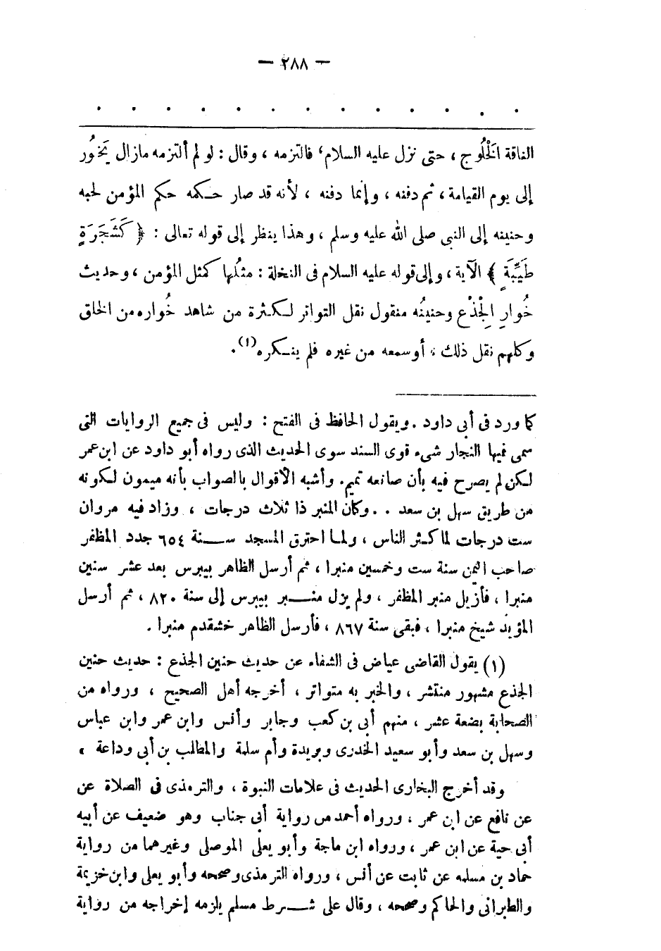 (1) يقول القاضى عياض فى الشفاء عن حديث حنين الجذع: حديث حنين الجذع مشهور منتشر، والخبر به متواتر، أخرجه أهل الصحيح، ورواه من الصحابة بضعة عشر، منهم أبى بن كعب وجابر وأنس وابن عمر وابن عباس وسهل بن سعد وأبو سعيد الخدرى وبريدة وأم سلمة والمطلب بن أبى وداعة» وقد أخرج البخارى الحديث فى علامات النبوة، والترمذى فى الصلاة عن عن نافع عن ابن عمر، ورواه أحمد من رواية أبى جناب وهو ضعيف عن أبيه أبى حية عن ابن عمر، ورواه ابن ماجة وأبو يعلى الموصلى وغيرهما من رواية حماد بن مسلمه عن ثابت عن أنس، ورواه الترمذى وصححه وأبو يعلى وابن خزيمة والطبرانى والحاكم وصححه، وقال على شرط مسلم يلزمه إخراجه من رواية