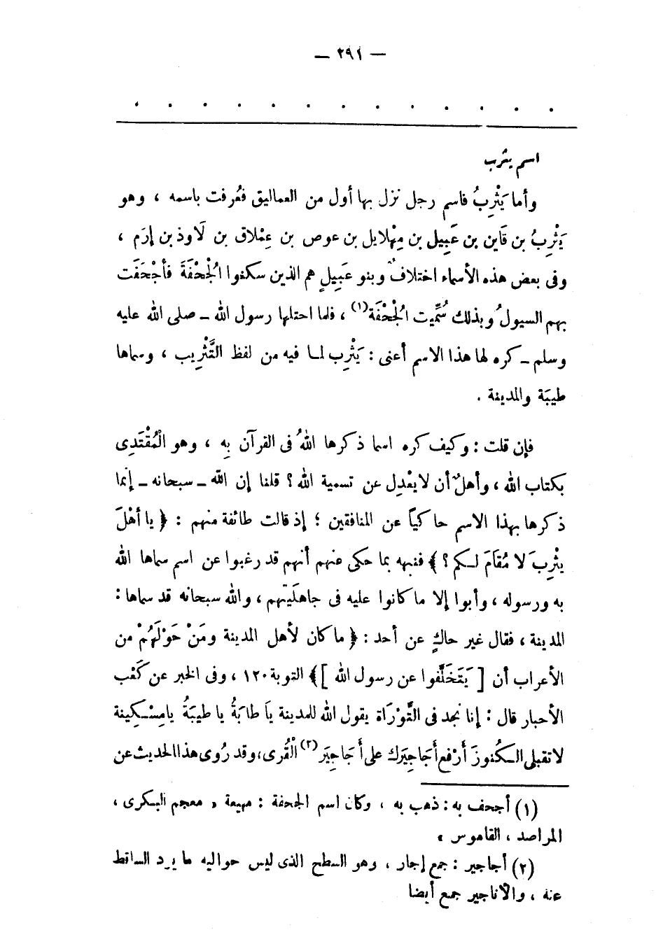 فَإِنْ قُلْت: وَكَيْفَ كَرِهَ اسْمًا ذَكَرَهَا اللهُ فِي الْقُرْآنِ بِهِ، وَهُوَ الْمُقْتَدِي بِكِتَابِ اللهِ، وَأَهْلٌ أَنْ لَا يَعْدِلَ عَنْ تَسْمِيَةِ اللهِ؟ قُلْنَا إنّ اللهَ- سُبْحَانَهُ- إنّمَا ذَكَرَهَا بِهَذَا الِاسْمِ حَاكِيًا عَنْ الْمُنَافِقِينَ؛ إذْ قَالَتْ طَائِفَةٌ مِنْهُمْ: يَا أَهْلَ يَثْرِبَ لَا مُقامَ لَكُمْ؟ فَنَبّهَهُ بِمَا حَكَى عَنْهُمْ أَنّهُمْ قَدْ رَغِبُوا عَنْ اسْمٍ سَمّاهَا اللهُ بِهِ وَرَسُولُهُ، وَأَبَوْا إلّا مَا كَانُوا عَلَيْهِ فِي جَاهِلِيّتِهِمْ، وَاَللهُ سُبْحَانَهُ قَدْ سَمّاهَا: