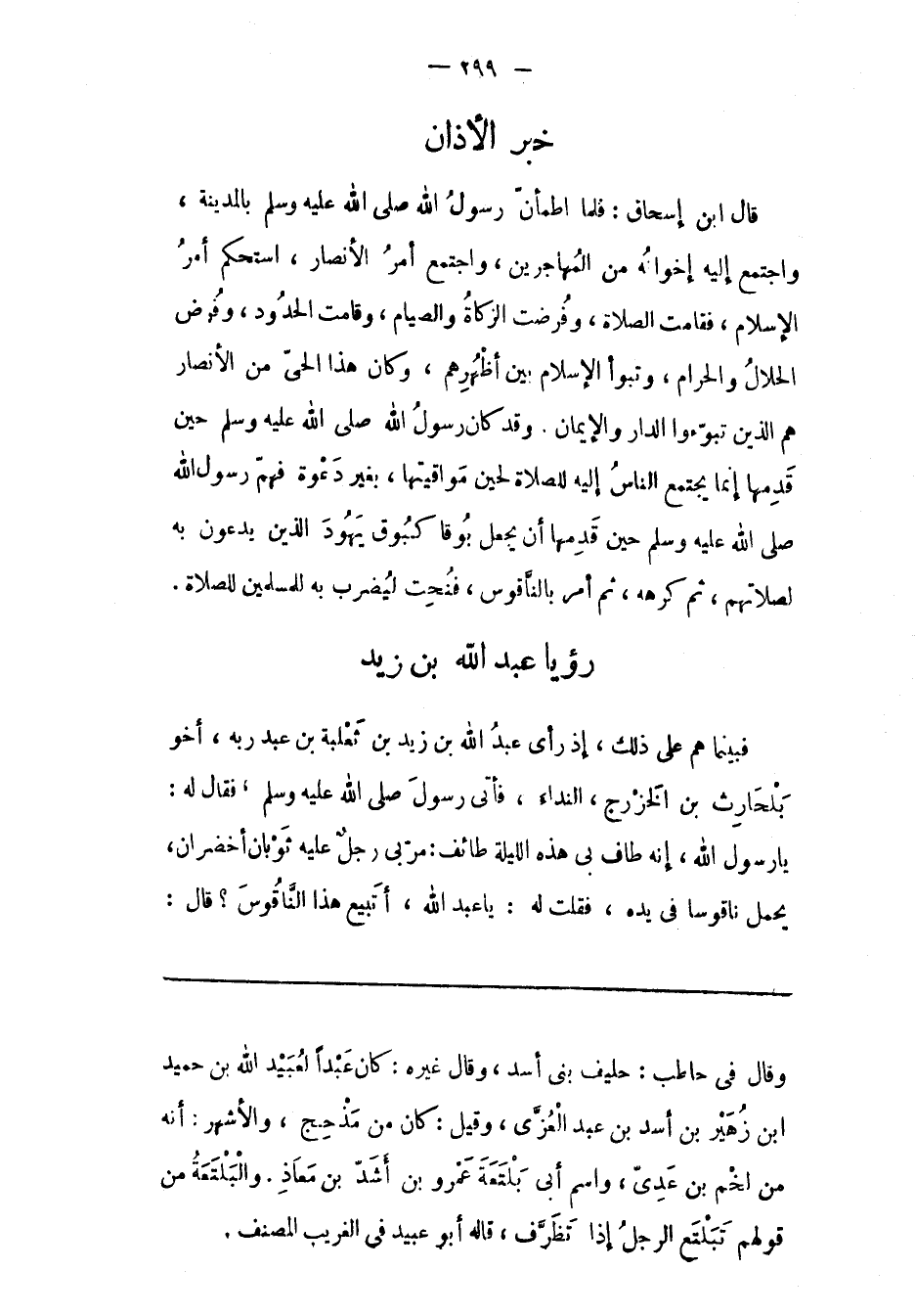 فَبَيْنَمَا هُمْ عَلَى ذَلِكَ، إذْ رَأَى عَبْدِ اللهِ بْنِ زَيْدِ بْنِ ثَعْلَبَةَ بْنِ عبد رَبّهِ، أَخُو بَلْحَارِثِ بْنِ الْخَزْرَجِ، النّدَاءَ، فَأَتَى رسول الله صلى الله عليه وسلم، فقال لَهُ: