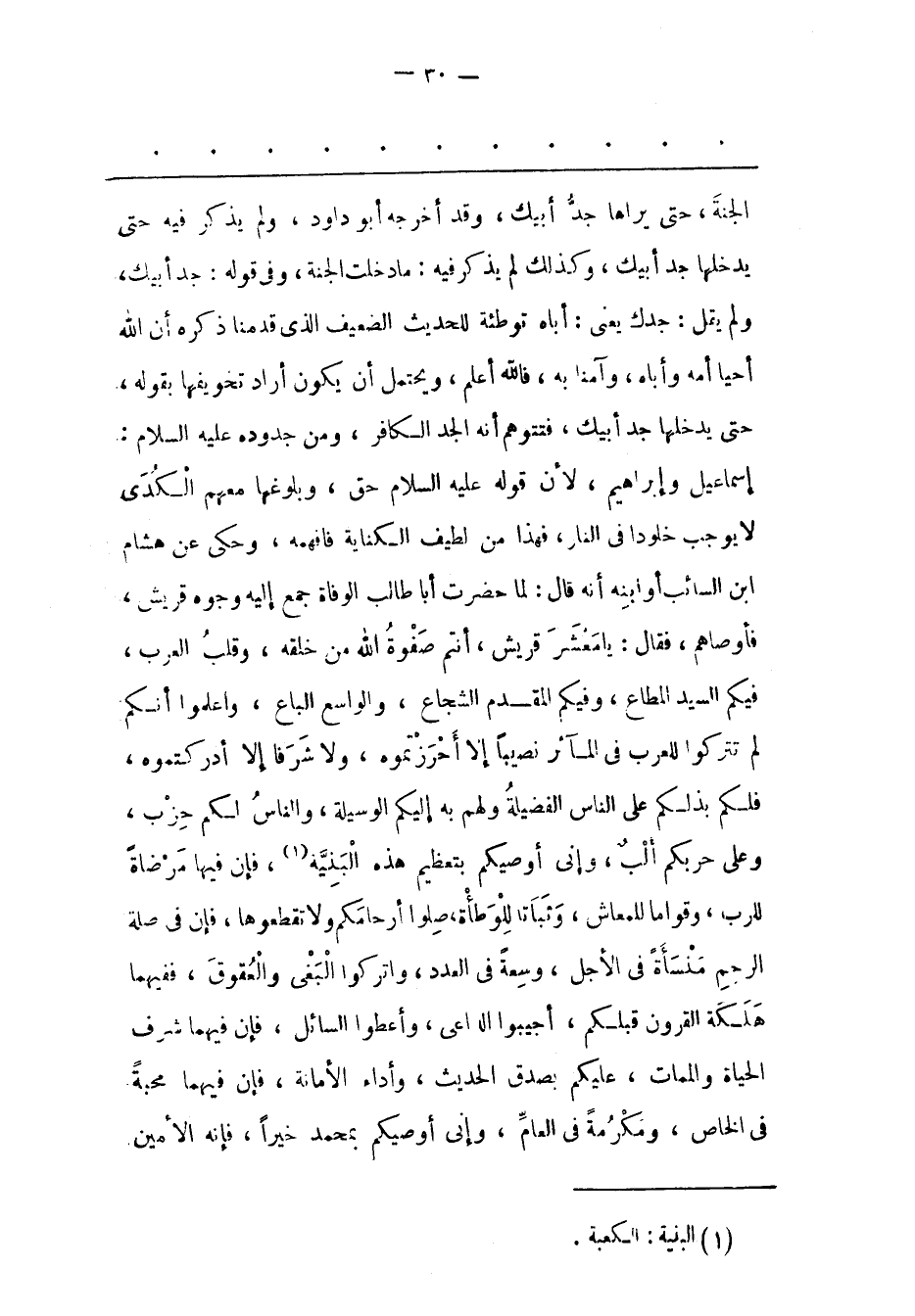 إسْمَاعِيلُ وَإِبْرَاهِيمُ، لِأَنّ قَوْلَهُ عَلَيْهِ السّلَامُ حَقّ، وَبُلُوغُهَا مَعَهُمْ الْكُدَى لَا يُوجِبُ خُلُودًا فِي النّارِ، فَهَذَا مِنْ لَطِيفِ الْكِنَايَةِ فافهمه، وحكى عن هشام ابن السّائِبِ أَوْ ابْنِهِ أَنّهُ قَالَ: لَمّا حَضَرَتْ أَبَا طَالِبٍ الْوَفَاةُ جَمَعَ إلَيْهِ وُجُوهَ قُرَيْشٍ، فَأَوْصَاهُمْ، فَقَالَ: يَا مَعْشَرَ قُرَيْشٍ، أَنْتُمْ صَفْوَةُ اللهِ مِنْ خَلْقِهِ، وَقَلْبُ الْعَرَبِ، فِيكُمْ السّيّدُ الْمُطَاعُ، وَفِيكُمْ الْمُقَدّمُ الشّجَاعُ، وَالْوَاسِعُ الْبَاعِ، وَاعْلَمُوا أَنّكُمْ لَمْ تَتْرُكُوا لِلْعَرَبِ فِي الْمَآثِرِ نَصِيبًا إلّا أَحْرَزْتُمُوهُ، وَلَا شَرَفًا إلّا أَدْرَكْتُمُوهُ، فَلَكُمْ بِذَلِكُمْ عَلَى النّاسِ الْفَضِيلَةُ وَلَهُمْ بِهِ إلَيْكُمْ الْوَسِيلَةُ، وَالنّاسُ لَكُمْ حِزْبٌ، وَعَلَى حَرْبِكُمْ أَلْبٌ، وَإِنّي أُوصِيكُمْ بِتَعْظِيمِ هَذِهِ الْبَنِيّةِ «1» ، فَإِنّ فِيهَا مَرْضَاةً لِلرّبّ، وَقِوَامًا لِلْمَعَاشِ، وَثَبَاتًا لِلْوَطْأَةِ، صِلُوا أَرْحَامَكُمْ وَلَا تَقْطَعُوهَا، فَإِنّ فِي صِلَةِ الرّحِمِ مَنْسَأَةً فِي الْأَجَلِ، وَسَعَةً فِي الْعَدَدِ، وَاتْرُكُوا الْبَغْيَ وَالْعُقُوقَ، فَفِيهِمَا هَلَكَةُ الْقُرُونِ قَبْلَكُمْ، أَجِيبُوا الدّاعِيَ، وَأَعْطُوا السّائِلَ، فَإِنّ فِيهِمَا شَرَفَ الْحَيَاةِ وللمات، عَلَيْكُمْ بِصِدْقِ الْحَدِيثِ، وَأَدَاءِ الْأَمَانَةِ، فَإِنّ فِيهِمَا مَحَبّةً فِي الْخَاصّ، وَمَكْرُمَةً فِي الْعَامّ، وَإِنّي أوصيكم بمحمد خيرا، فإنه الأمين