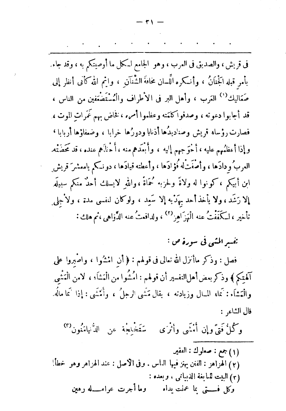 فَصْلٌ: وَذَكَرَ مَا أَنْزَلَ اللهُ تَعَالَى فِي قَوْلِهِمْ: أَنِ امْشُوا، وَاصْبِرُوا عَلى آلِهَتِكُمْ وَذَكَرَ بَعْضُ أَهْلِ التّفْسِيرِ أَنّ قَوْلَهُمْ: امْشُوا مِنْ الْمَشَاءِ، لَا مِنْ الْمَشْيِ وَالْمَشَاءُ: نَمَاءُ الْمَالِ وَزِيَادَتُهُ، يُقَالُ مَشَى الرّجُلُ، وَأَمْشَى: إذَا نَمَا مَالُهُ قَالَ الشّاعِرُ: