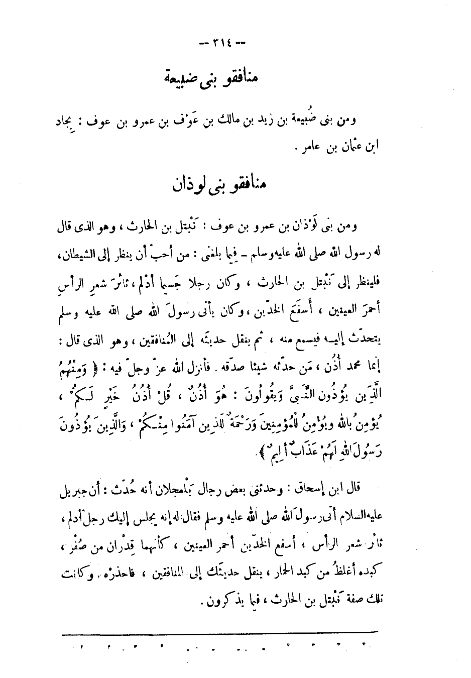 وَمِنْ بَنِي لَوْذَانَ بْنِ عَمْرِو بْنِ عَوْفٍ: نَبْتَلُ بْنُ الْحَارِثِ، وَهُوَ الّذِي قَالَ لَهُ رَسُولُ اللهِ صَلَّى اللَّهُ عَلَيْهِ وسلم- فيما بَلَغَنِي: مَنْ أَحَبّ أَنْ يَنْظُرَ إلَى الشّيْطَانِ، فَلْيَنْظُرْ إلَى نَبْتَلَ بْنِ الْحَارِثِ، وَكَانَ رَجُلًا جسيما أدلم، ثَائِرَ شَعْرِ الرّأْسِ أَحْمَرَ الْعَيْنَيْنِ، أَسْفَعَ الْخَدّيْنِ، وَكَانَ يَأْتِي رَسُولَ اللهِ صَلّى اللهُ عَلَيْهِ وَسَلّمَ يَتَحَدّثُ إلَيْهِ فَيَسْمَعُ مِنْهُ، ثُمّ يَنْقُلُ حَدِيثَهُ إلَى الْمُنَافِقِينَ، وَهُوَ الّذِي قَالَ: