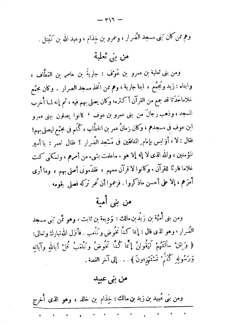 وَمِنْ بَنِي ثَعْلَبَةَ بْنِ عَمْرِو بْنِ عَوْفٍ: جَارِيَةُ بْنُ عَامِرِ بْنِ الْعَطّافِ، وَابْنَاهُ: زَيْدٌ وَمُجَمّعٌ، ابْنَا جَارِيَةَ، وَهُمْ مِمّنْ اتّخَذَ مَسْجِدَ الضّرَارِ. وَكَانَ مُجَمّعٌ غُلَامًا حَدَثًا قَدْ جَمَعَ مِنْ الْقُرْآنِ أَكْثَرَهُ، وَكَانَ يُصَلّي بِهِمْ فِيهِ، ثم إنه لما أخرب المسجد، وذهب رجال من بَنِي عَمْرِو بْنِ عَوْفٍ، كَانُوا يُصَلّونَ بِبَنِي عمرو ابن عَوْفٍ فِي مَسْجِدِهِمْ، وَكَانَ زَمَانُ عُمَرَ بْنِ الْخَطّابِ، كُلّمَ فِي مُجَمّعٍ لِيُصَلّيَ بِهِمْ؛ فَقَالَ: لا، أو ليس بِإِمَامِ الْمُنَافِقِينَ فِي مَسْجِدِ الضّرَارِ؟ فَقَالَ لِعُمَرَ: يَا أَمِيرَ الْمُؤْمِنِينَ، وَاَللهِ الّذِي لَا إلَهَ إلّا هُوَ، مَا عَلِمْت بِشَيْءٍ مِنْ أَمْرِهِمْ، وَلَكِنّي كُنْت غُلَامًا قَارِئًا لِلْقُرْآنِ، وَكَانُوا لَا قُرْآنَ مَعَهُمْ، فَقَدّمُونِي أُصَلّي بِهِمْ، وَمَا أَرَى أَمْرَهُمْ، إلّا عَلَى أَحْسَنِ مَا ذَكَرُوا. فَزَعَمُوا أن عمر تركه فصلى بقومه.