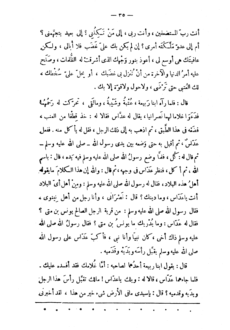 فَلَمّا جَاءَهُمَا عَدّاسٌ، قَالَا لَهُ: وَيْلَك يا عدّاس! ما لك تُقَبّلُ رَأْسَ هَذَا الرّجُلِ وَيَدَيْهِ وَقَدَمَيْهِ؟ قَالَ: يَا سَيّدِي مَا فِي الْأَرْضِ شَيْءٌ خَيْرٌ مِنْ هَذَا، لَقَدْ أَخْبَرَنِي